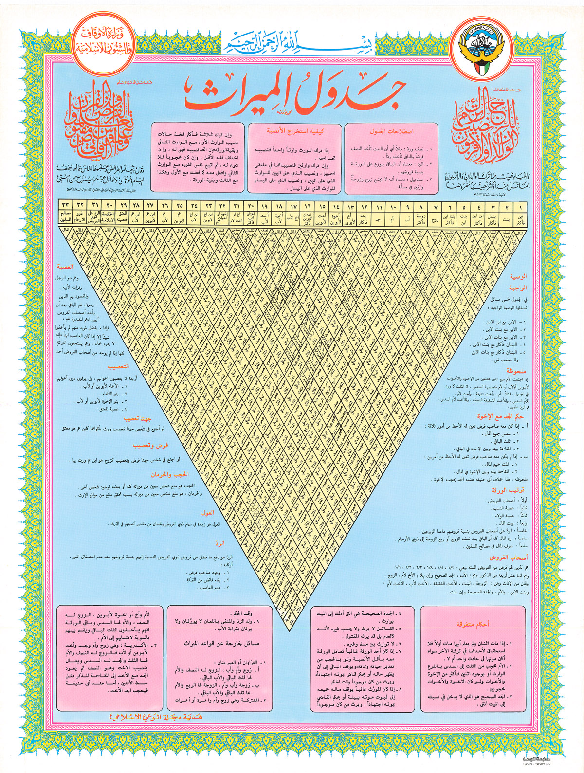 بوستر متميز من إصدار مجلة الوعي الإسلامي، يحتوي على رسم توضيحي، يبين أحكام الفرائض والمواريث، بأسلوب سهل مختصر لتيسير المواريث على طلبة العلم.