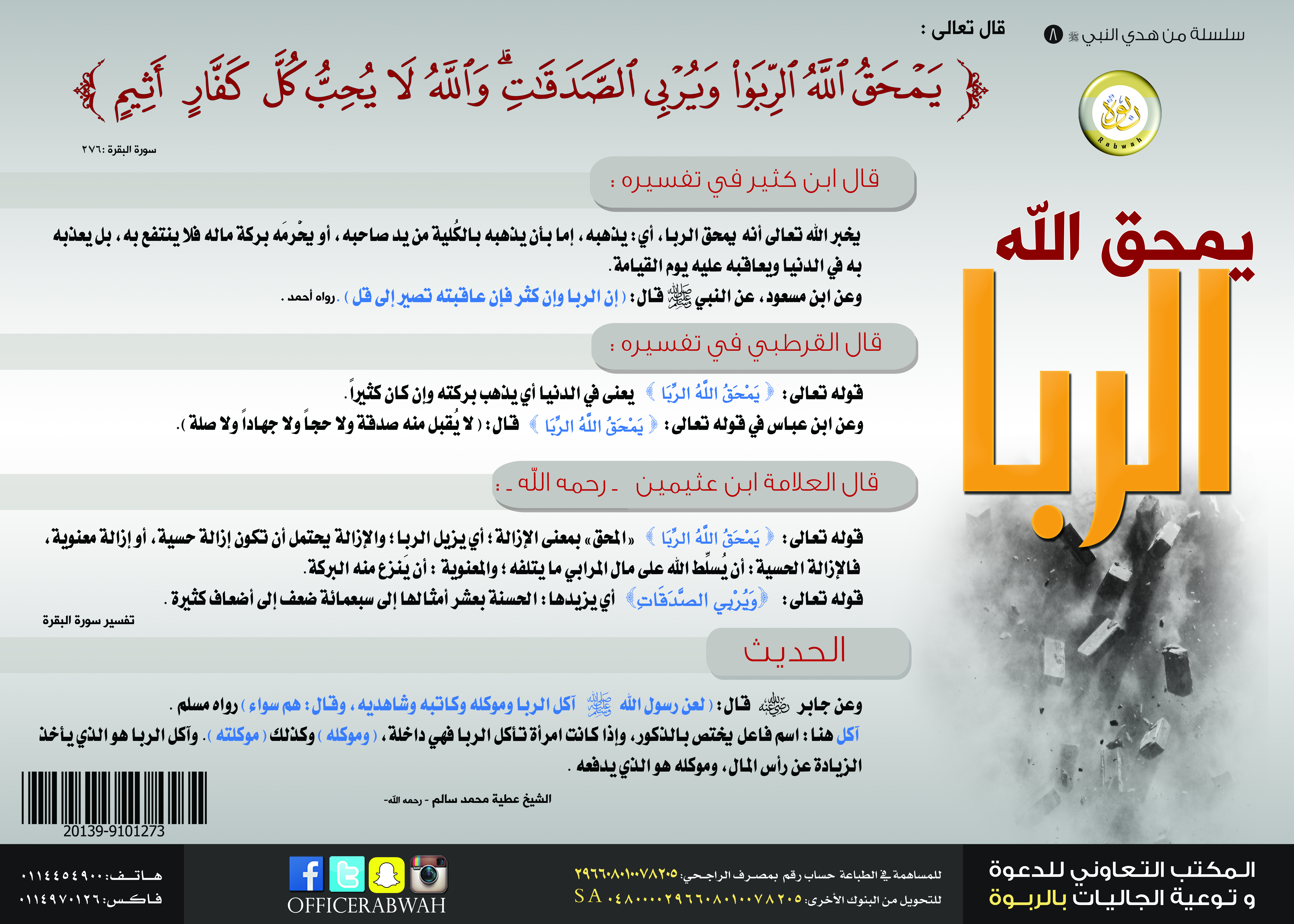 بوستر مميز يبين خطورة الربا في ظل تفسير قوله تعالى {يَمْحَقُ اللَّهُ الرِّبَا وَيُرْبِي الصَّدَقَاتِ وَاللَّهُ لاَ يُحِبُّ كُلَّ كُفَّارٍ أَثِيمٍ}.