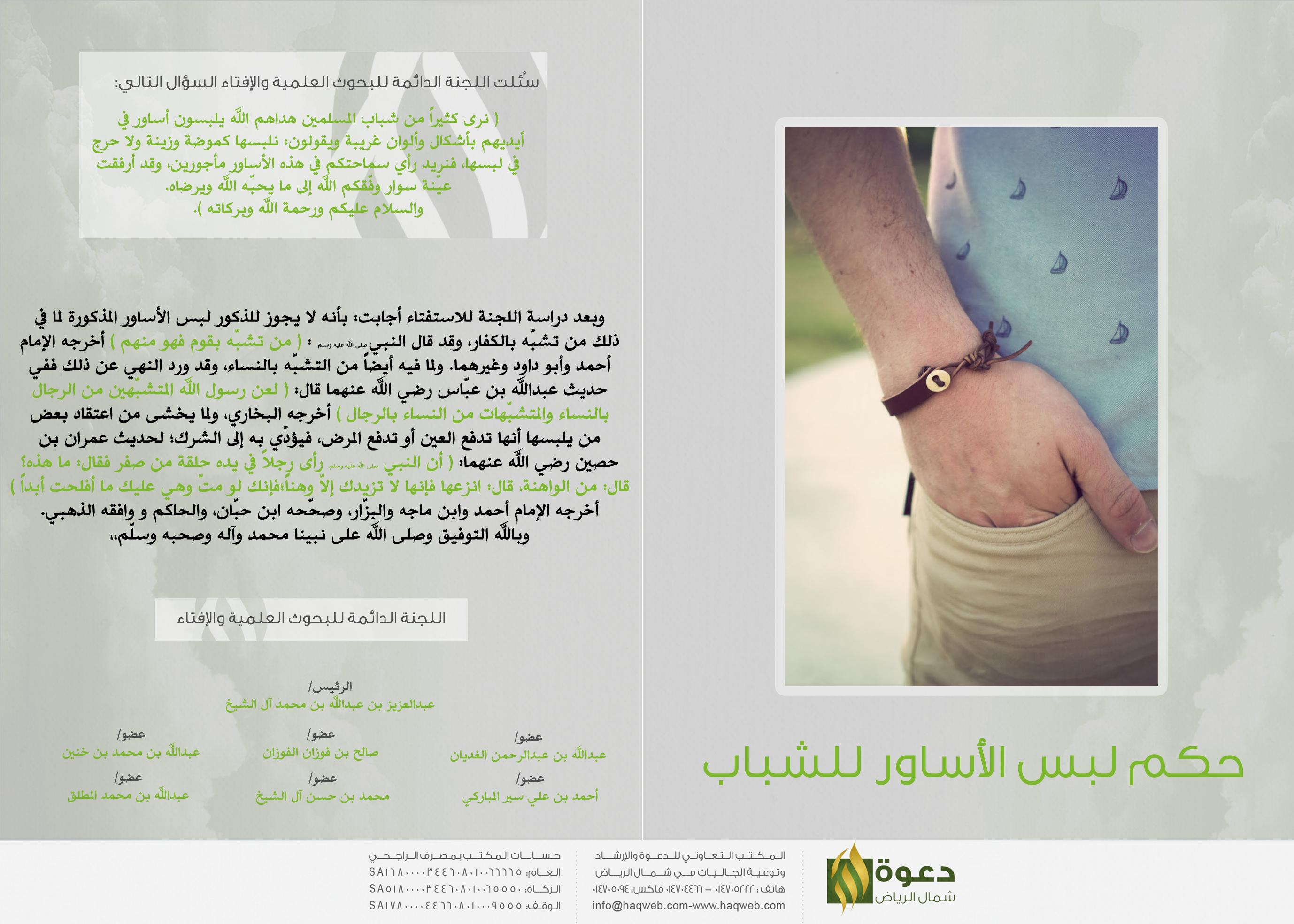 بوستر يحتوي على سؤال أجابت عنه اللجنة الدائمة للبحوث العلمية والإفتاء، ونصه: «نرى كثيرًا من شباب المسلمين هداهم الله يلبسون أساور في أيديهم بأشكال وألوان غريبة، ويقولون: نلبسها كموضة وزينة، ولا حرج في لبسها، فنريد رأي سماحتكم في هذه الأساور مأجورين ..».