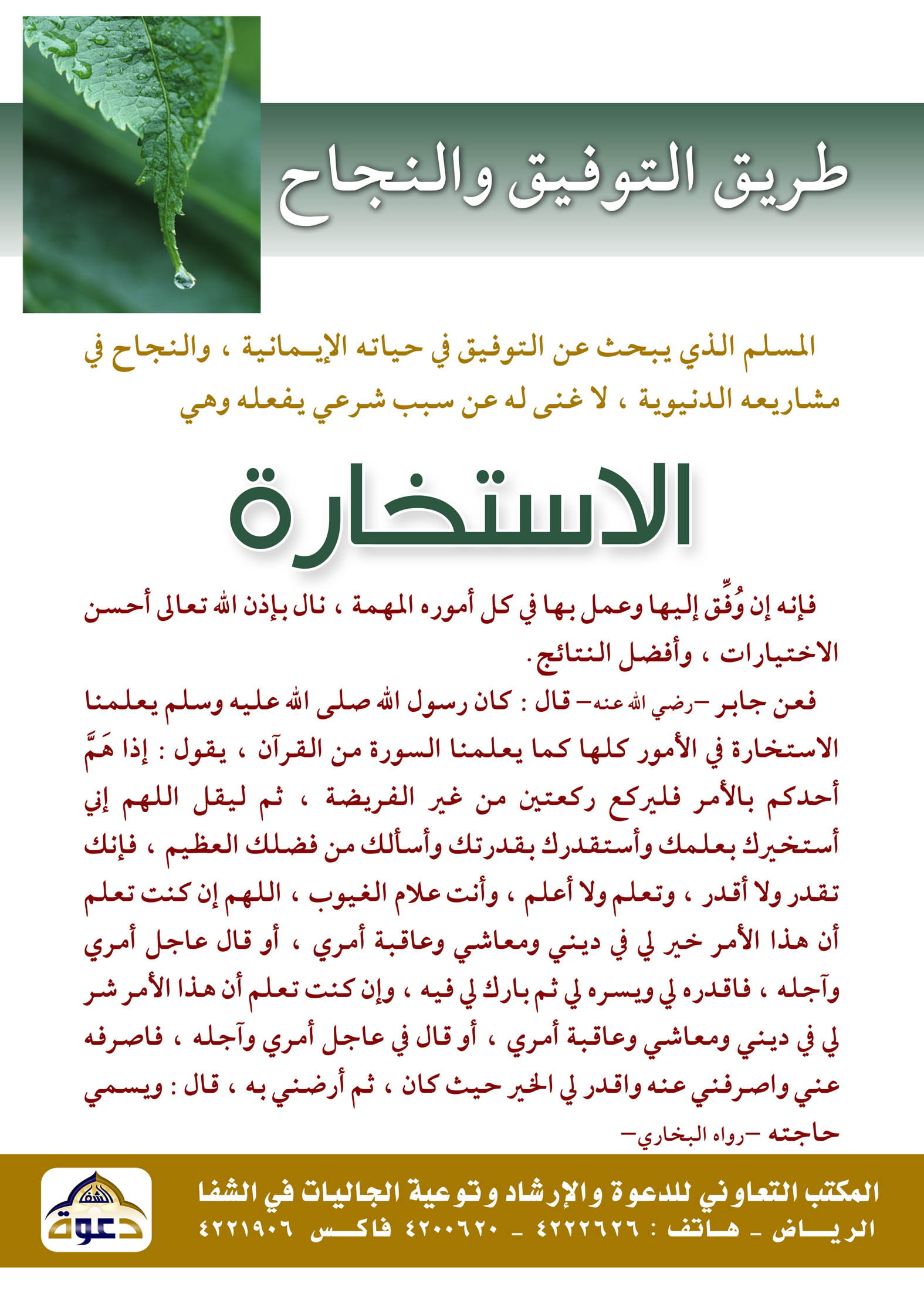 الاستخارة : بوستر يحتوي على دعاء الاستخارة، وهو الدعاء لا غنى عنه لكل مسلم يبحث عن التوفيق في حياته الإيمانية، والنجاح في مشاريعه الدنيوية.