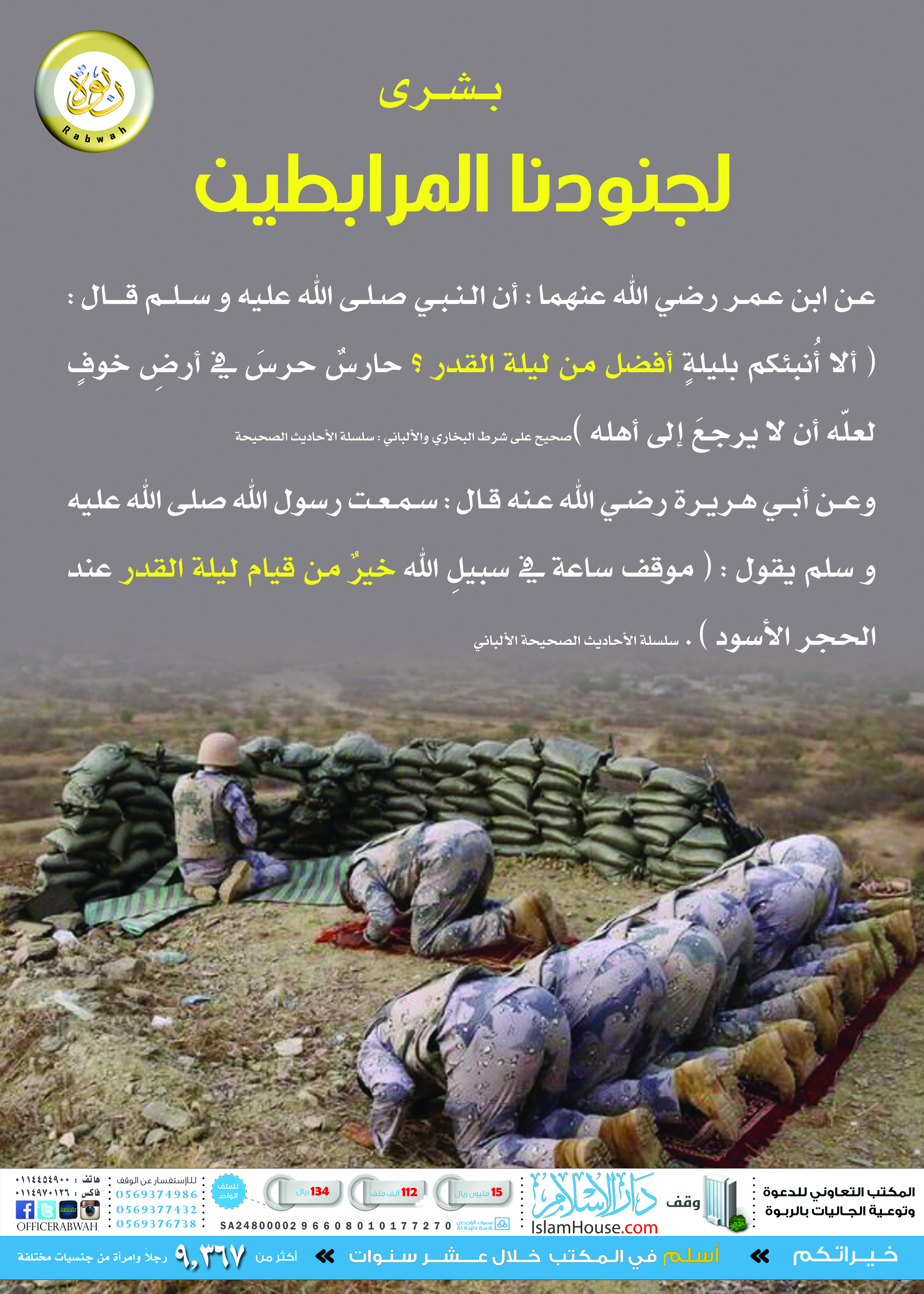 بوستر متميز يحتوي على فضل الرباط في سبيل الله، ومنها، حديث: {ألا أنبئكم بليلة أفضل من ليلة القدر؛ حارس حرس في أرض خوف لعله أن لا يرجع إلى أهله}.