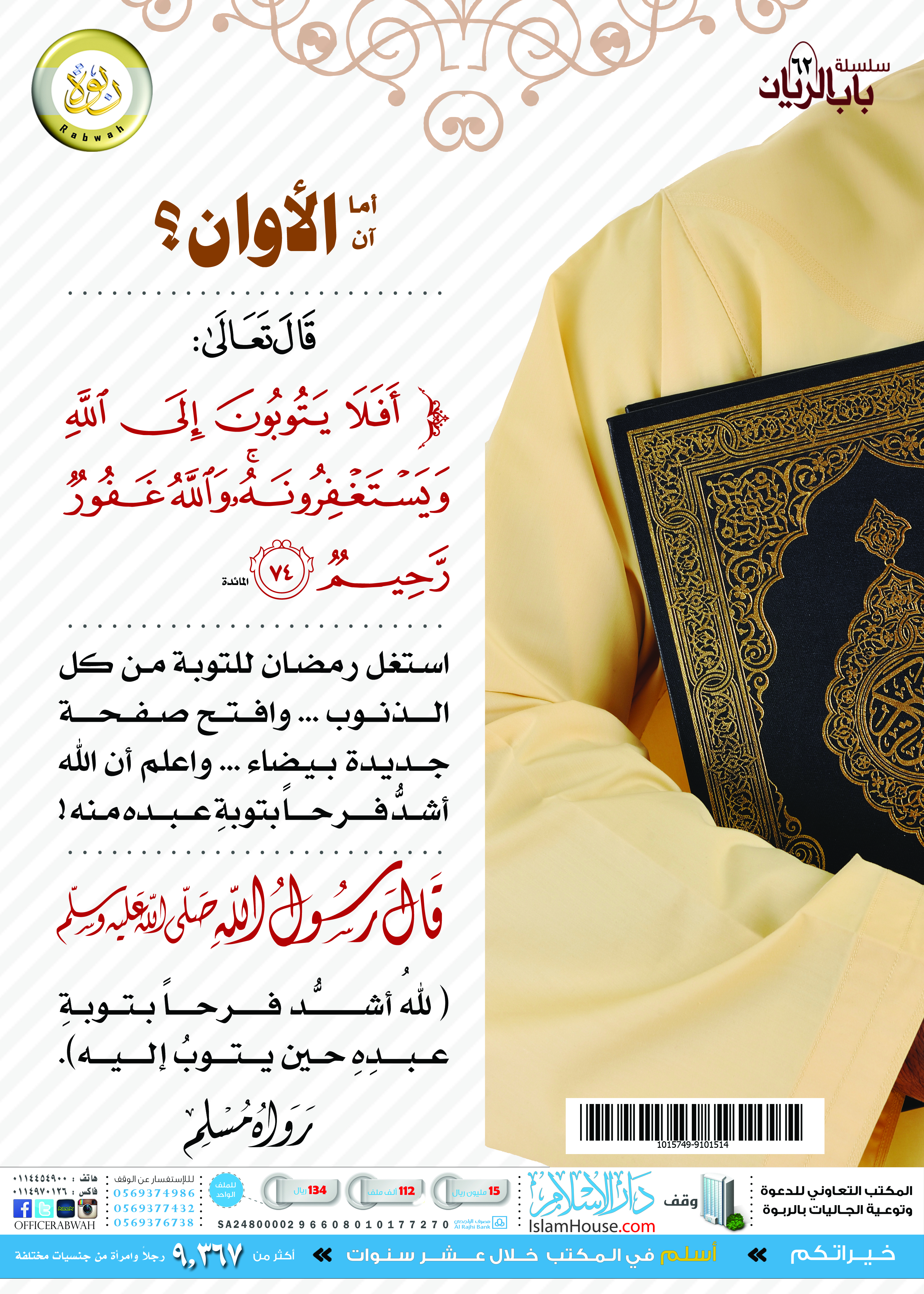 بوستر يحث المسلم على استغلال شهر رمضان للتوبة من كل الذنوب، وفتح صفحة جديدة بيضاء.