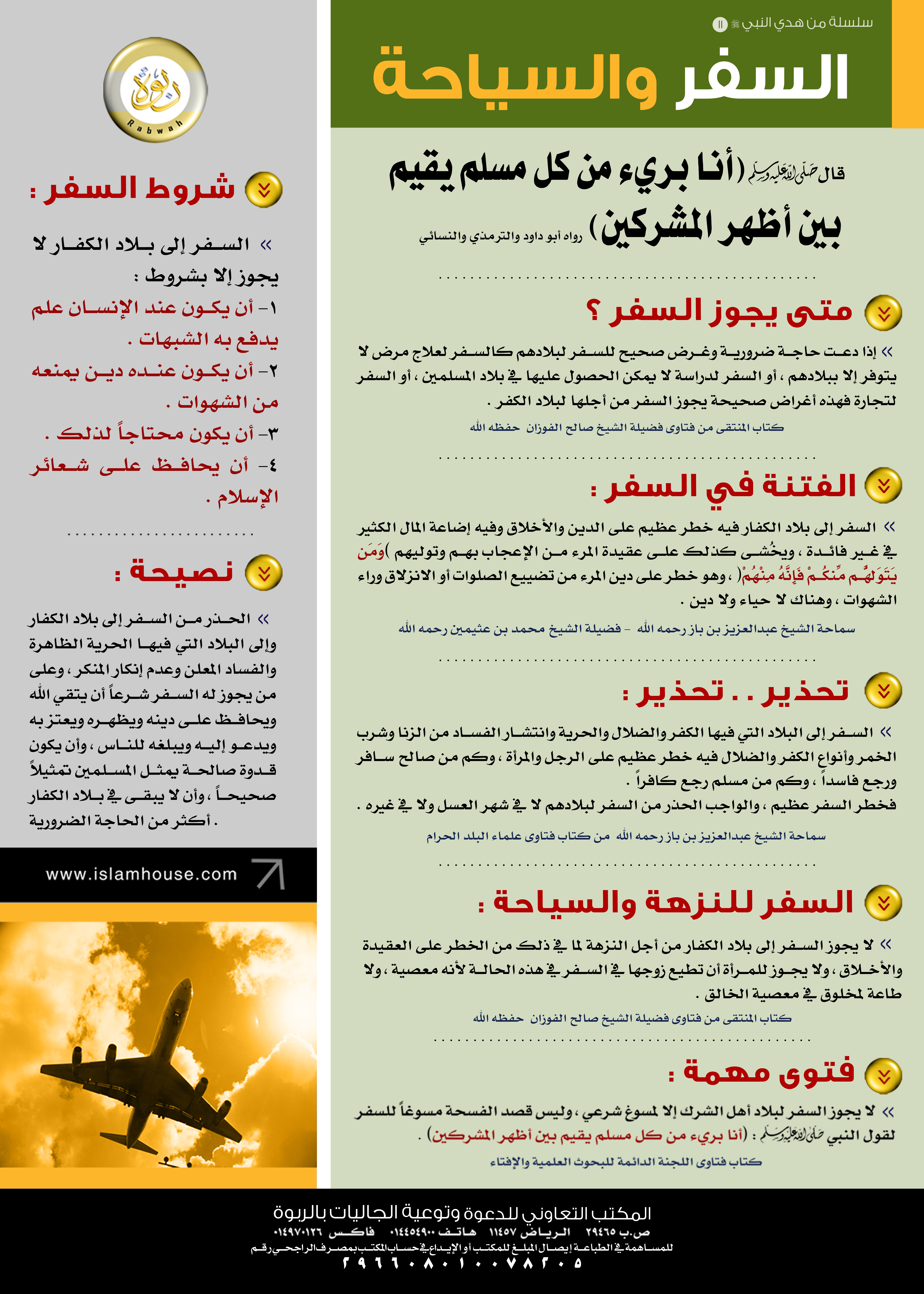 بوستر يبين بعض محاذير السفر إلى بلاد الكفار، مع بيان شروط ذلك السفر.