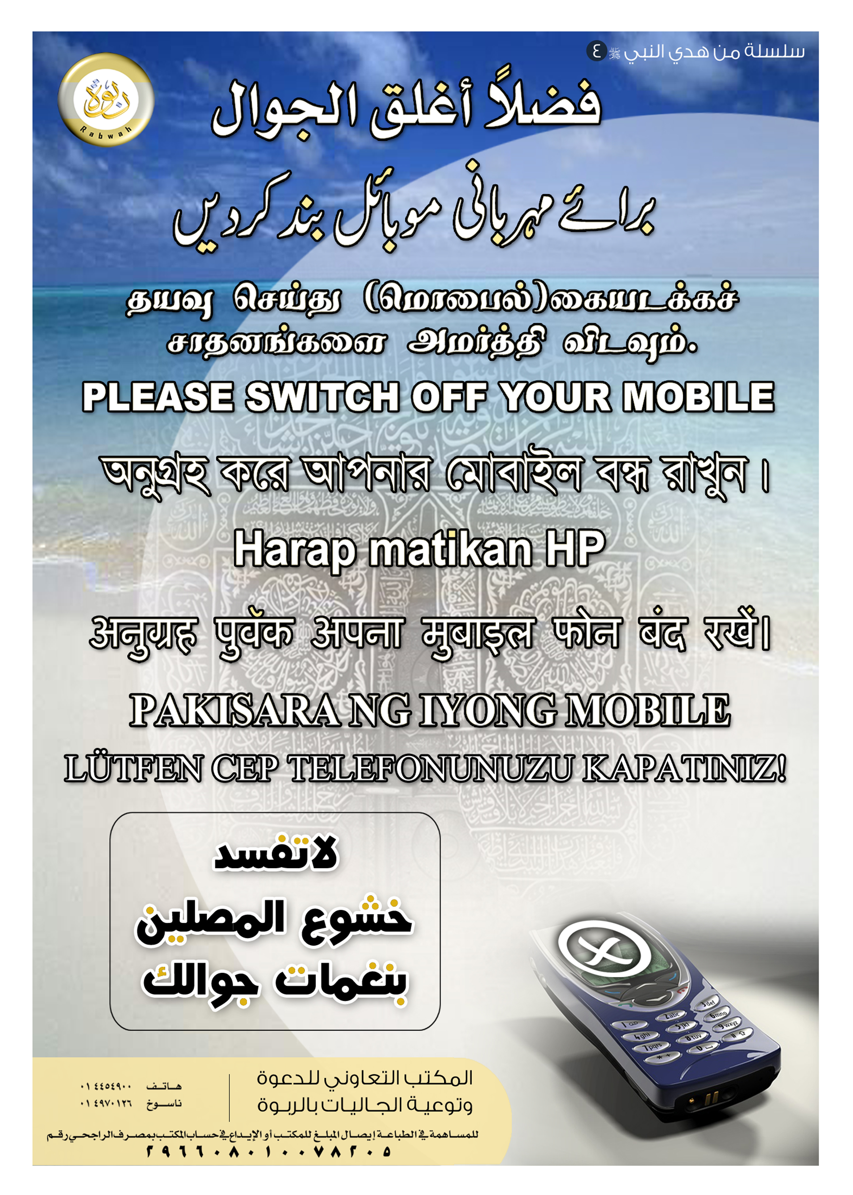 بوستر يحتوي على تذكير بإغلاق الجوال عند دخول المساجد مع ترجمتها إلى تسع لغات عالمية.