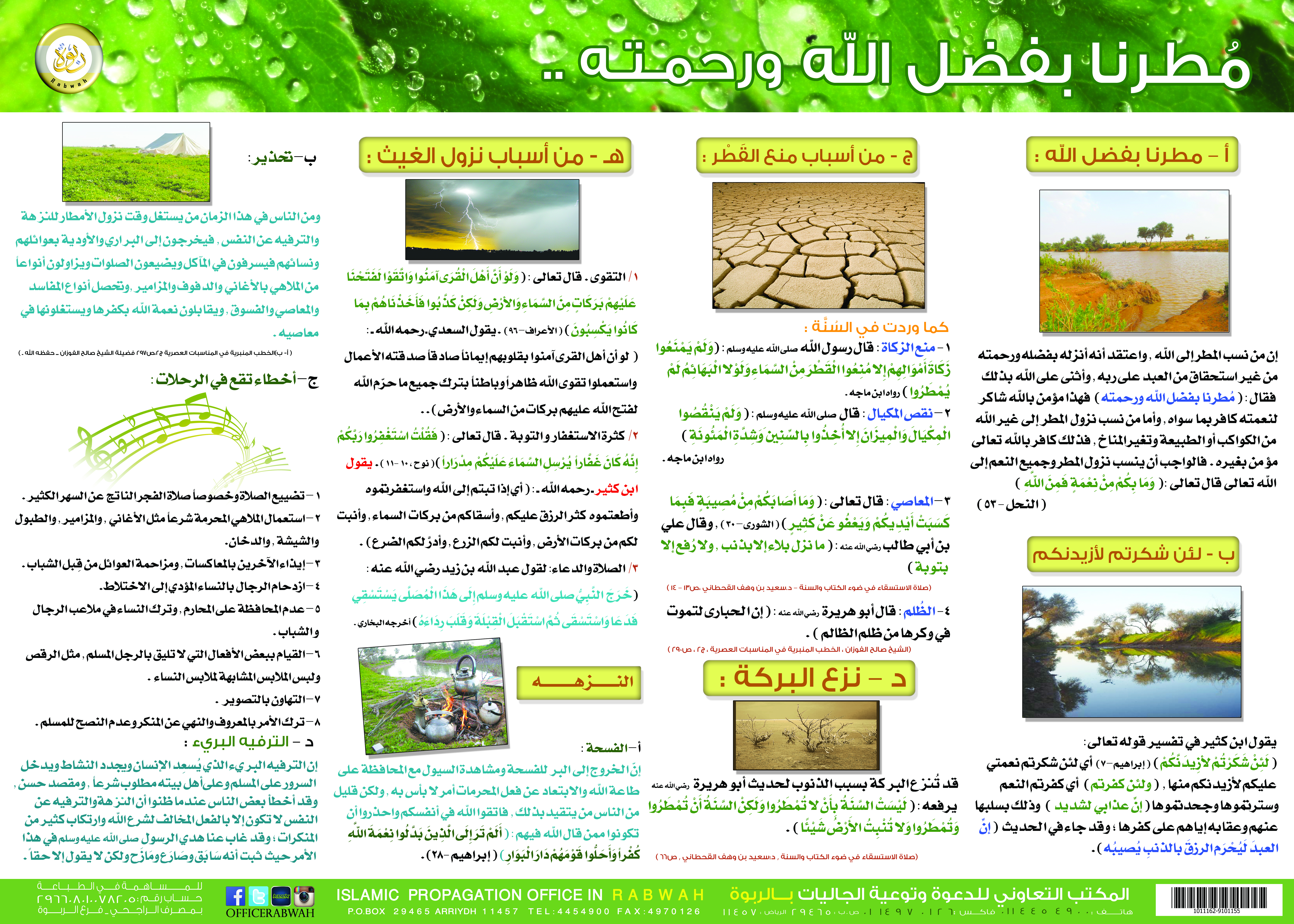 بوستر متميز يبين أن المطر بفضل الله ورحمته، مع بيان بعض أسباب منع القطر، وبعض أسباب نزول الغيث، وبعض الأخطاء التي تقع في الرحلات.
