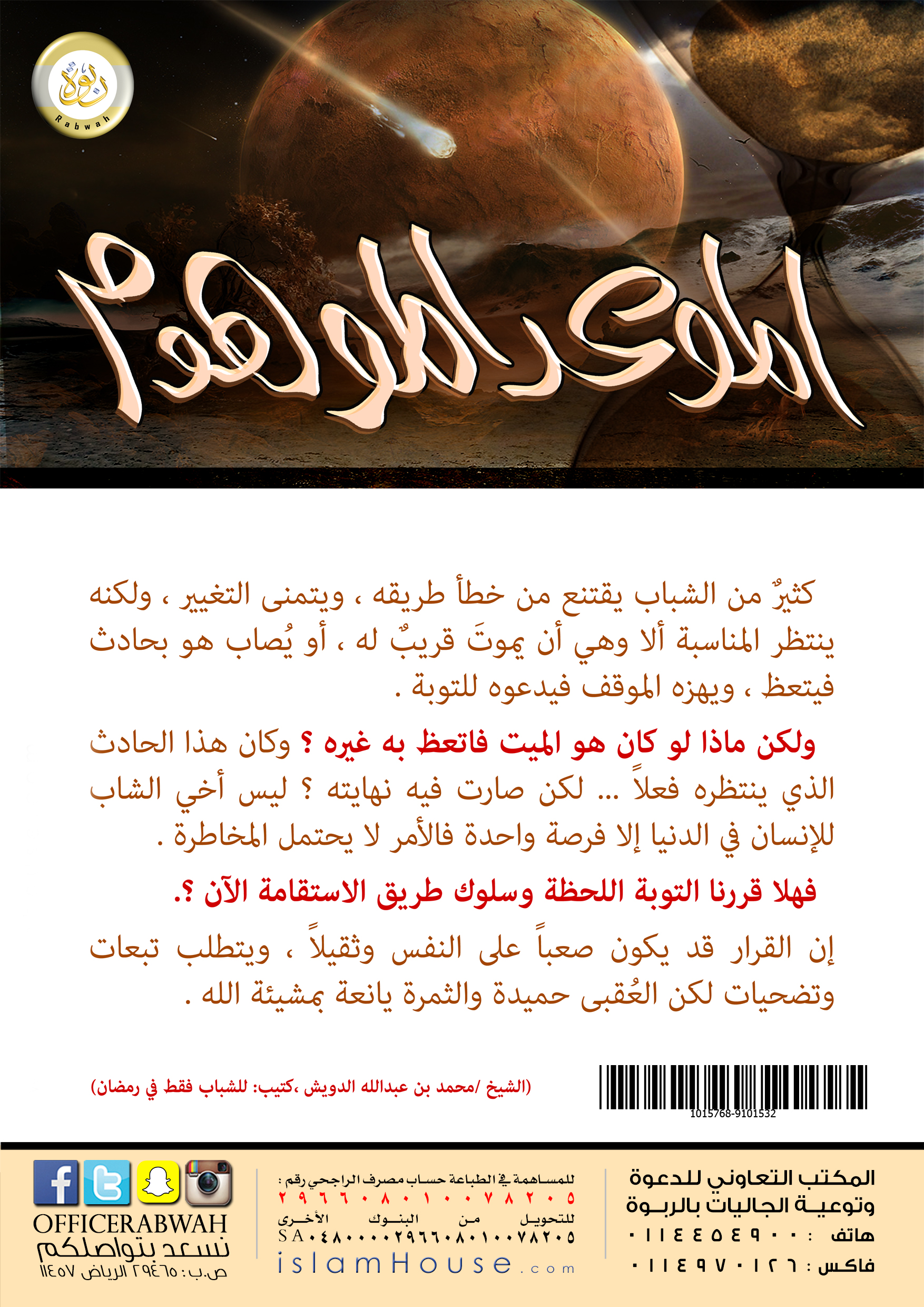 بوستر يحث الشباب على التوبة، فكثير من الشباب يقتنع من خطأ طريقه، ويتمنى التغيير، ولكنه ينتظر المناسبة ألا وهي أن يموت قريب له، أو يصاب هو بحادث فيتعظ، ويهزه الموقف فيدعوه للتوبة، ولكن ماذا لو كان هو الميت فاتعظ به غيره؟