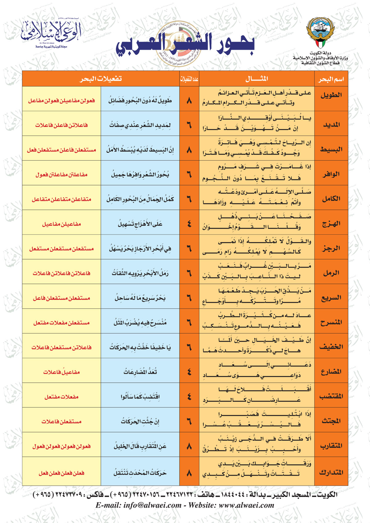 بحور الشعر العربي : بوستر من إصدار مجلة الوعي الإسلامي، يحتوي على جدول مصور مختصر ببحور الشعر العربي وأوزانه، وعدد تفعيلات كل بحر، وأمثلة عليه.