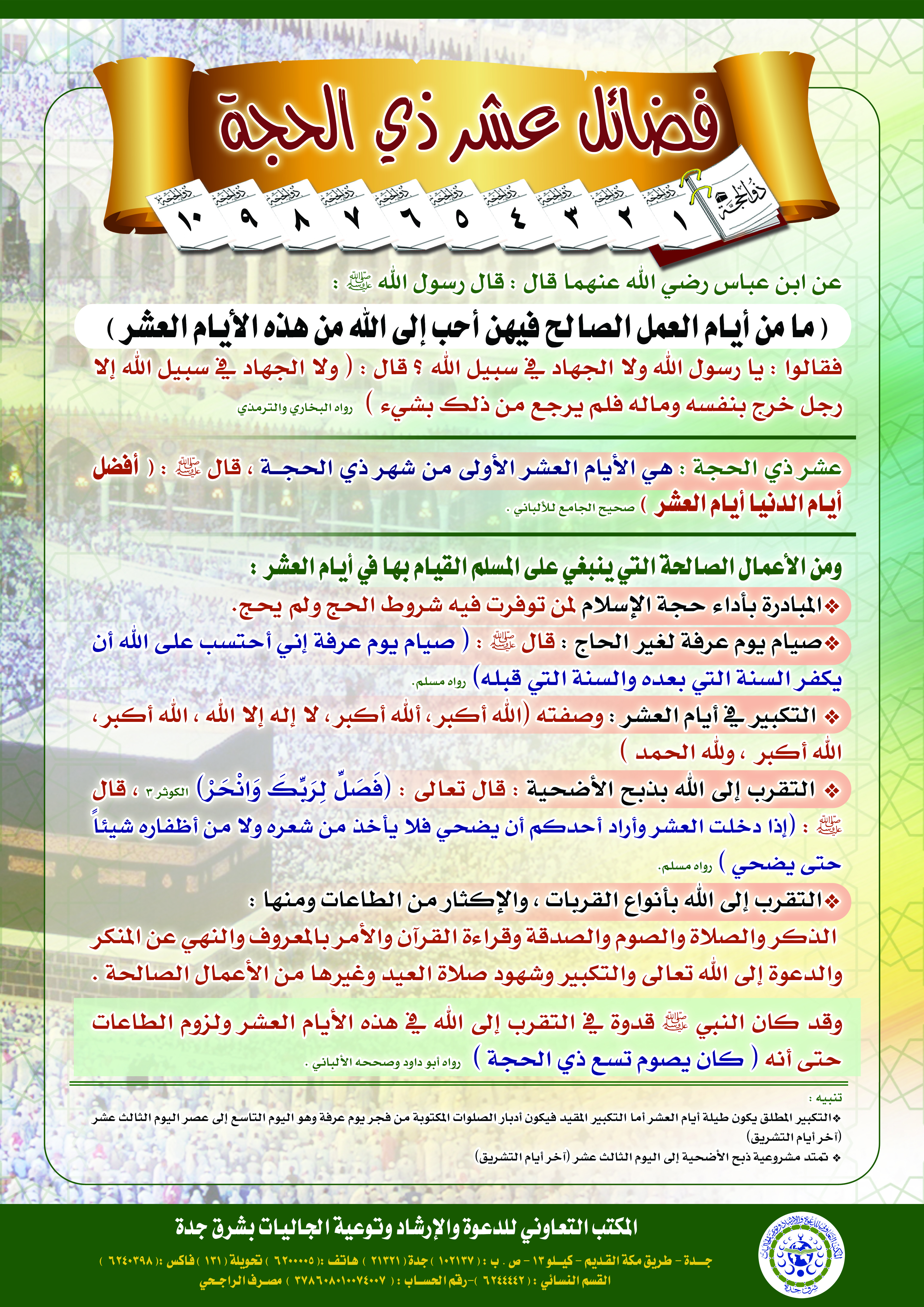 بوستر اشتمل على بعض فضائل عشر ذي الحجة، وبعض الأعمال الصالحة التي ينبغي القيام بها في أيام العشر.
