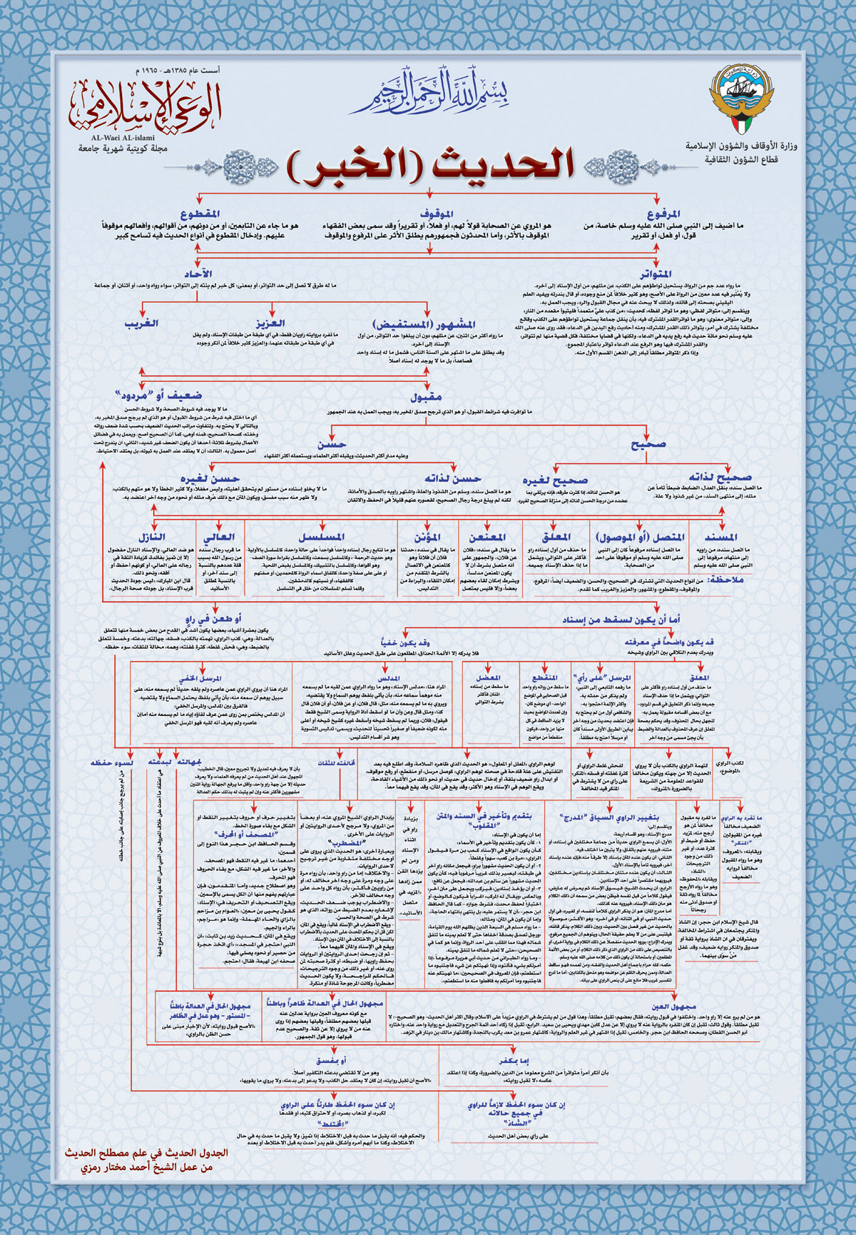 بوستر متميز من إعداد، الشيخ: أحمد مختار رمزي - رحمه الله - احتوى على رسم توضيحي يبين مسائل علم مصطلح الحديث باختصار.