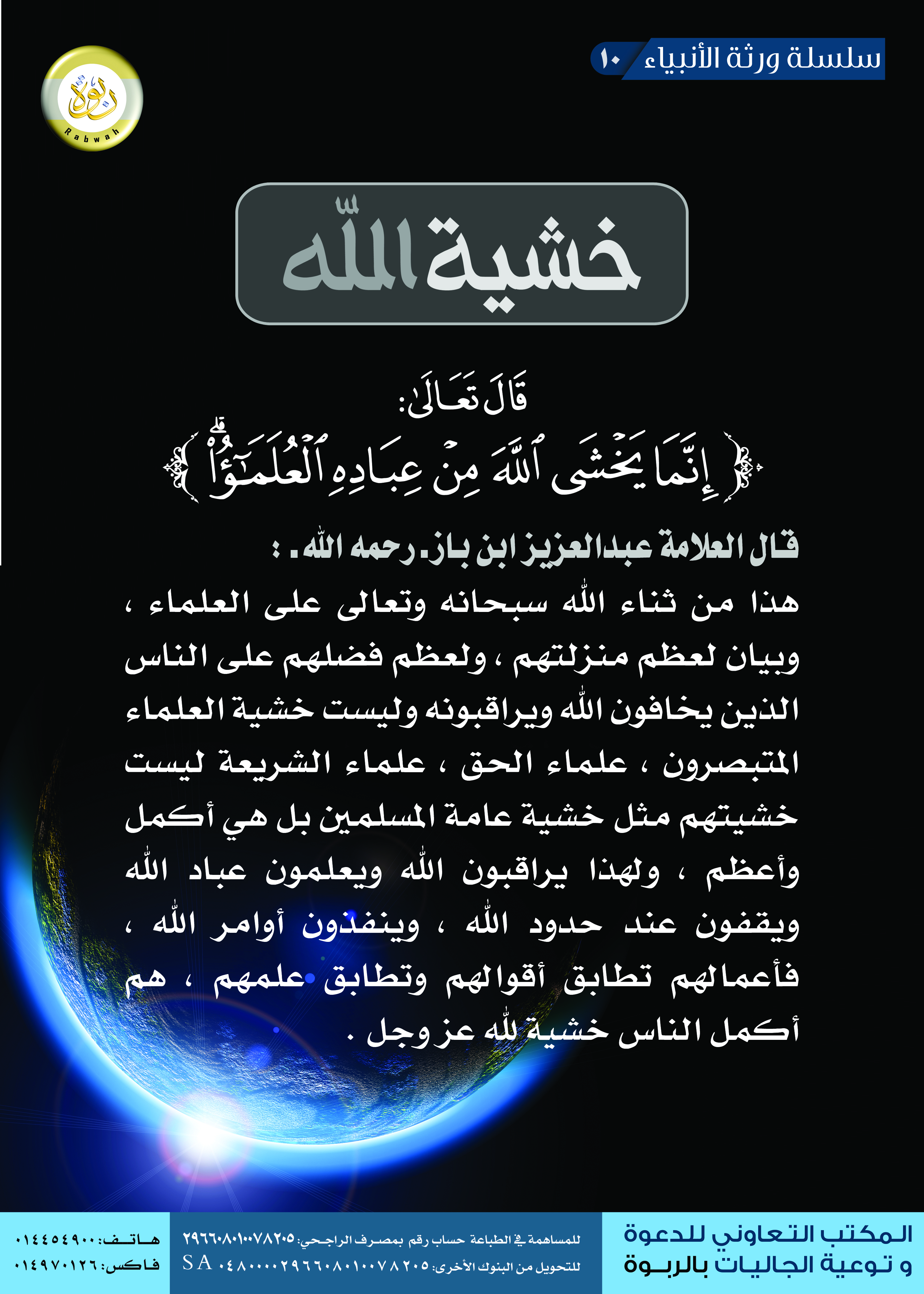 بوستر يحتوي على تعليق مختصر للشيخ ابن باز - رحمه الله - على قوله تعالى: {إِنَّمَا يَخْشَى اللَّهَ مِنْ عِبَادِهِ الْعُلَمَاء}.