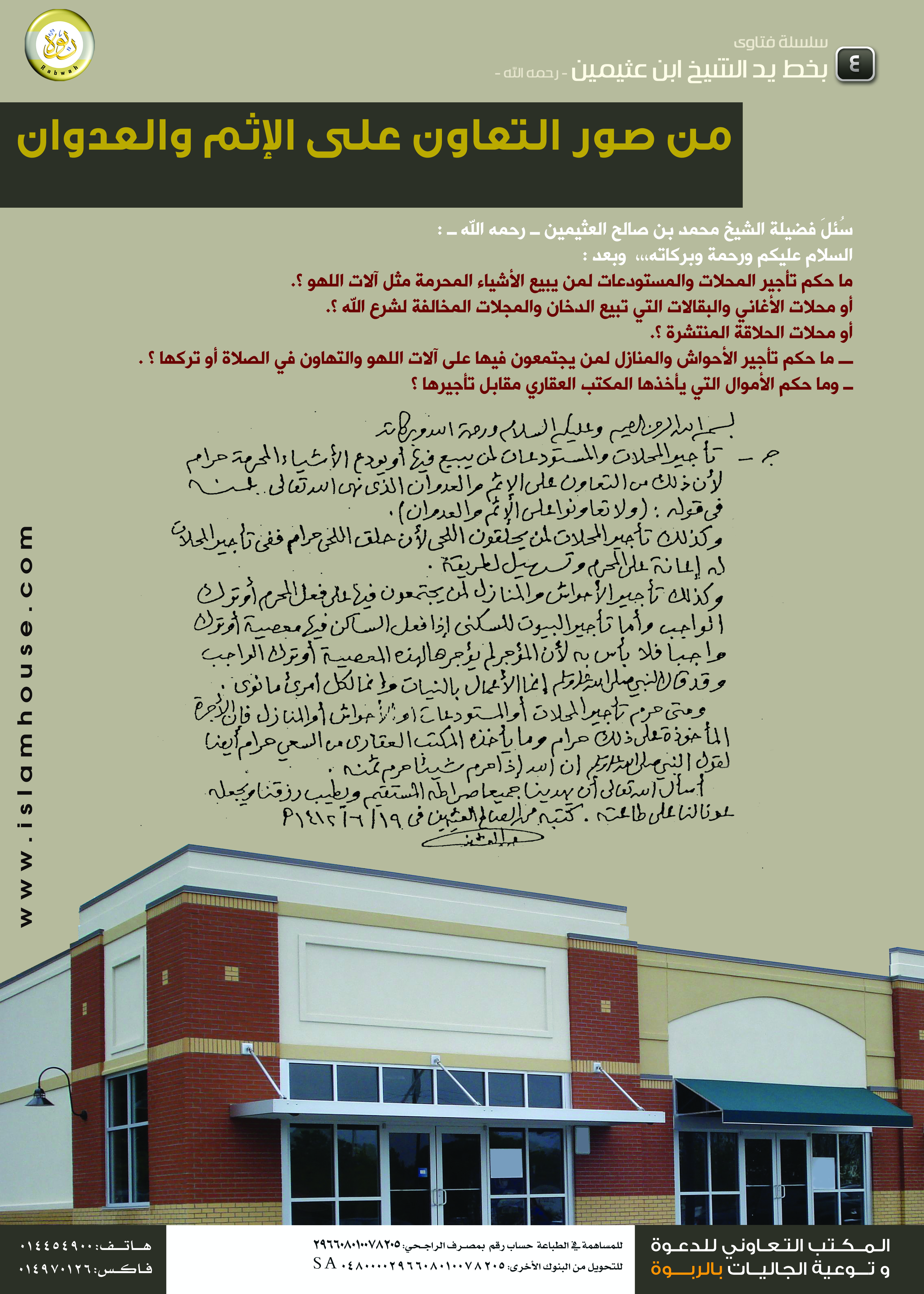 بوستر يحتوي على سؤال أجاب عنه الشيخ ابن عثيمين - رحمه الله - بخطه، ونصه: «ما حكم تأجير المحلات والمستودعات لمن يبيع الأشياء المحرمة مثل ألات اللهو أو محلات الأغانى أو البقالات التى تبيع الدخان؟».