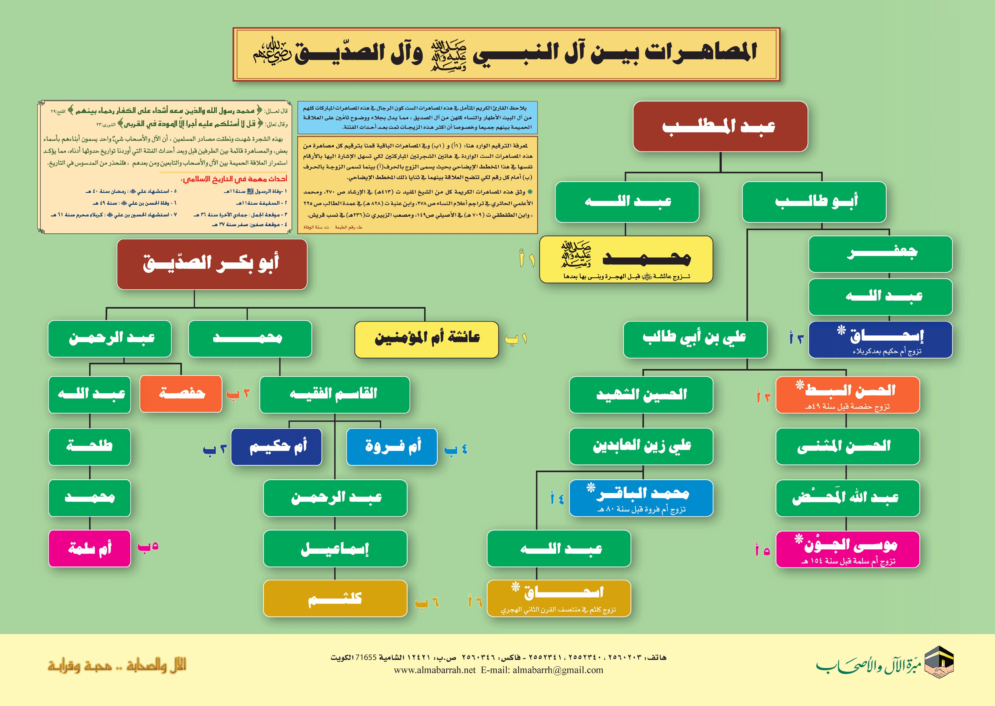 بوستر يحتوي على رسم توضيحي يبين بعض المصاهرات بين آل النبي - صلى الله عليه وسلم - وآل الصديق - رضي الله عنه -، وتبين شجرة المصاهرة أن العلاقة بينهم كانت قبل وبعد الفتنة، مما يؤكد استمرار العلاقة الحميمة بين الآل والأصحاب وذريتهم عبر الأجيال.