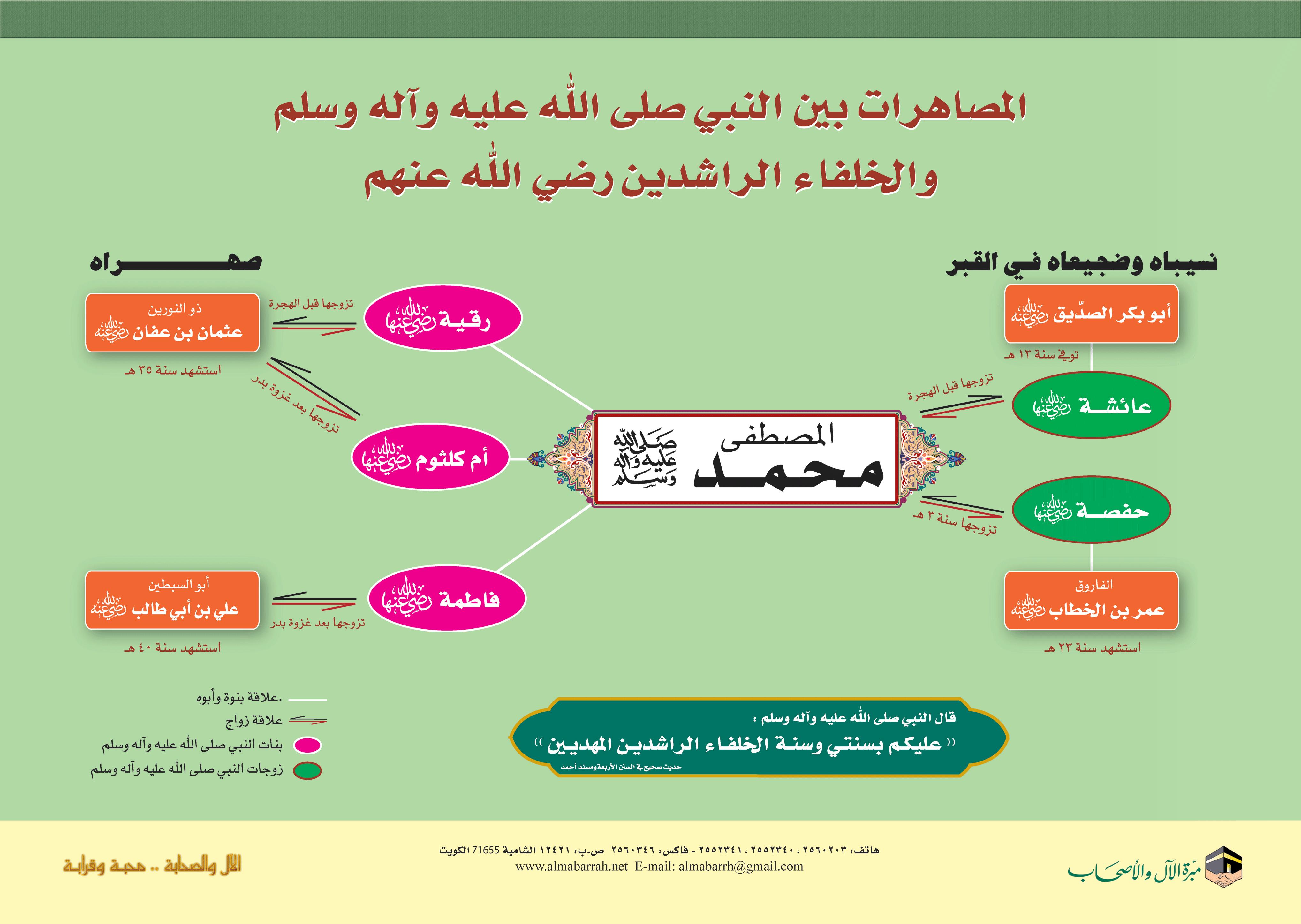 بوستر يحتوي على رسم توضيحي يبين بعض المصاهرات بين آل النبي - صلى الله عليه وسلم - والخلفاء الراشدين - رضي الله عنهم -، مما يؤكد فضل الخلفاء الراشدين وقربهم من بيت النبوة.