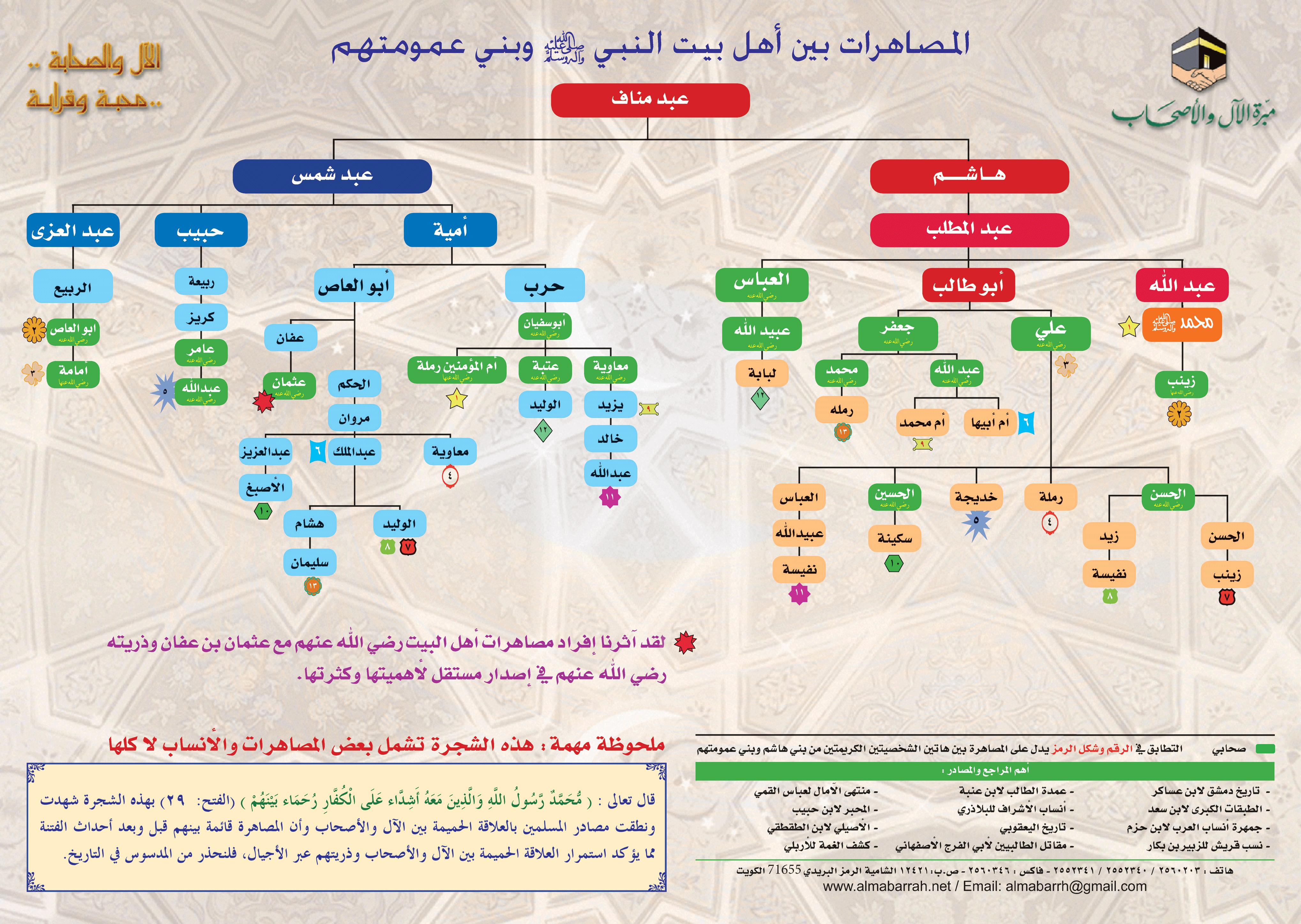بوستر يحتوي على رسم توضيحي يبين المصاهرات من أبناء هاشم بن عبد مناف وأبناء عبد شمس بن عبد مناف، وتوضح الشجرة أن المصاهرة قائمة بينهم قبل وبعد أحداث الفتنة، مما يؤكد استمرار العلاقة الحميمة بين الآل والأصحاب وذريتهم عبر الأجيال.