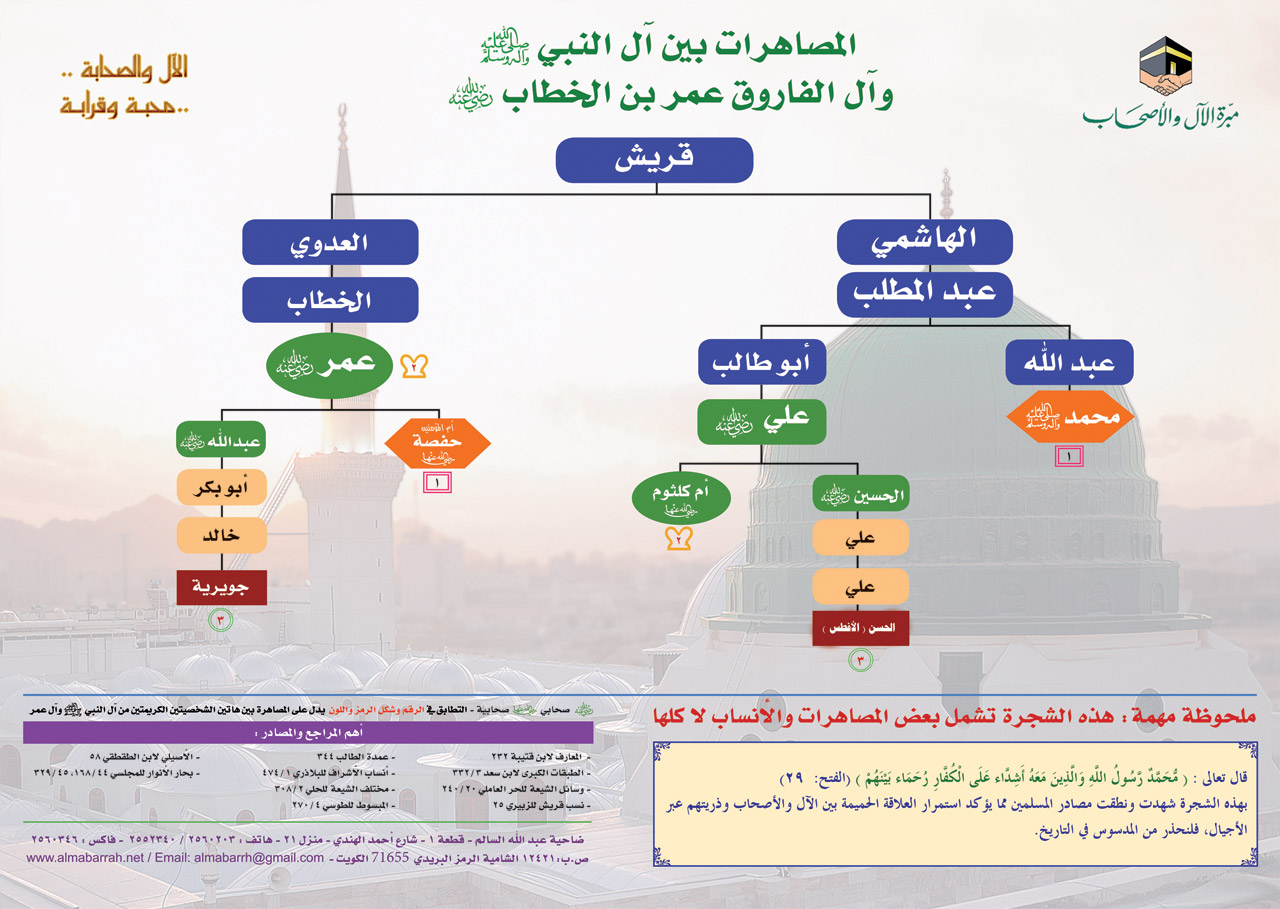بوستر يحتوي على رسم توضيحي يبين بعض المصاهرات بين آل النبي - صلى الله عليه وسلم - وآل الفاروق عمر بن الخطاب - رضي الله عنه -، وتبين شجرة المصاهرة أن العلاقة بينهم كانت قبل وبعد الفتنة، مما يؤكد استمرار العلاقة الحميمة بين الآل والأصحاب وذريتهم عبر الأجيال.
