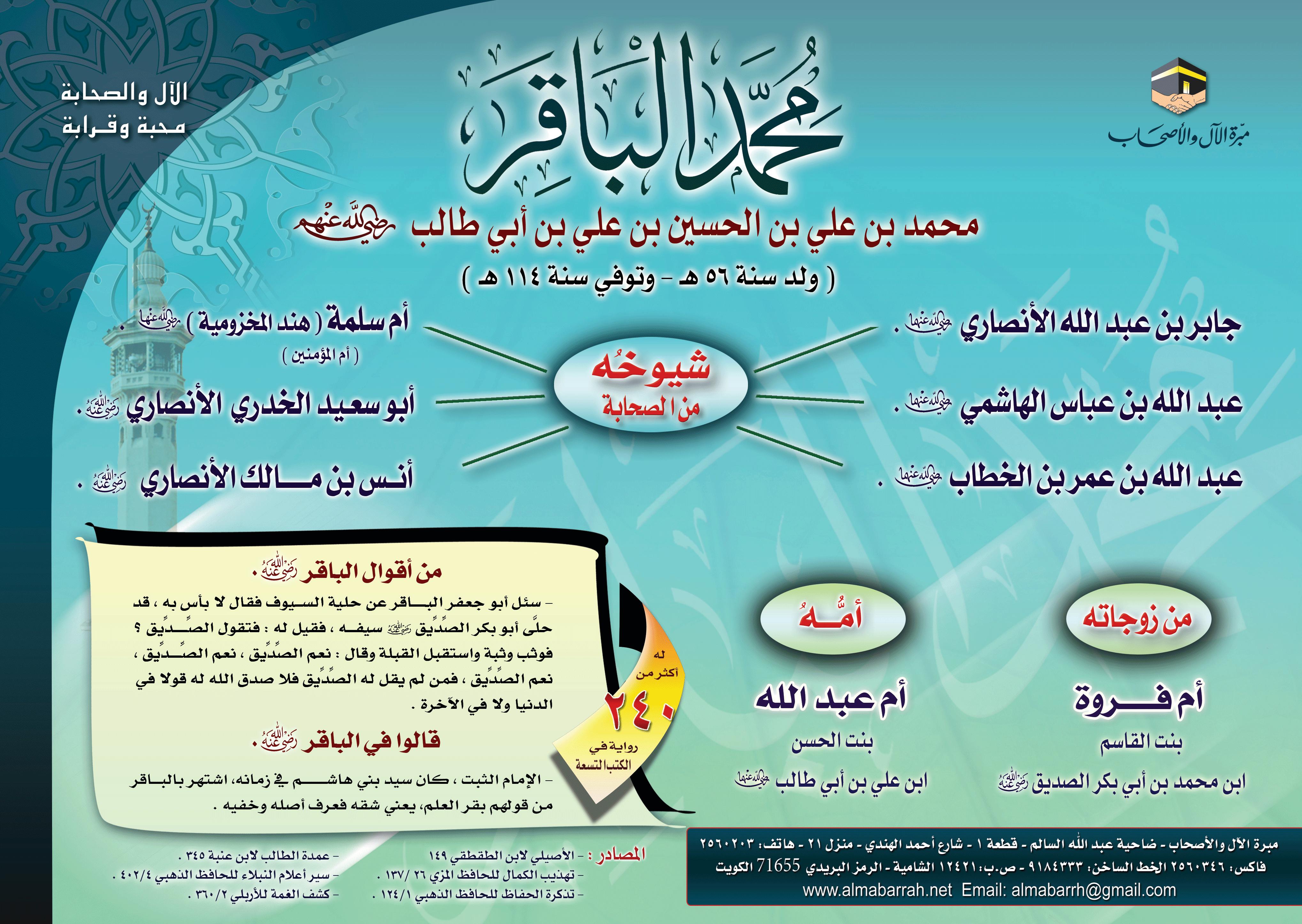 بوستر يبين نسب الإمام الثبت أبو جعفر محمد بن علي الباقر، وشيوخه، وشيء من أقواله وما قيل عنه.