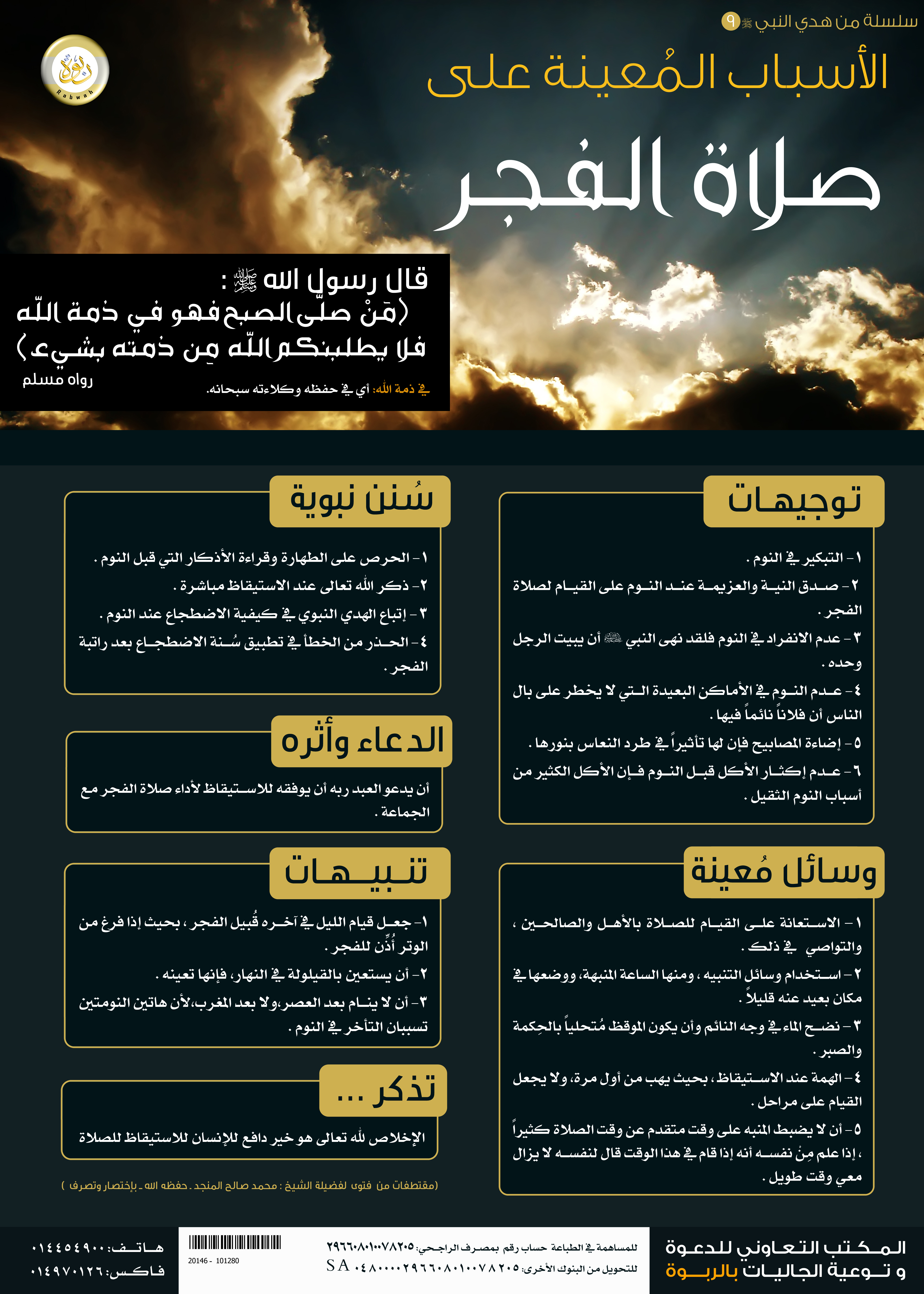 بوستر متميز يمكن قراءته دون تحميل يحتوي على بعض الأسباب المعينة على صلاة الفجر.