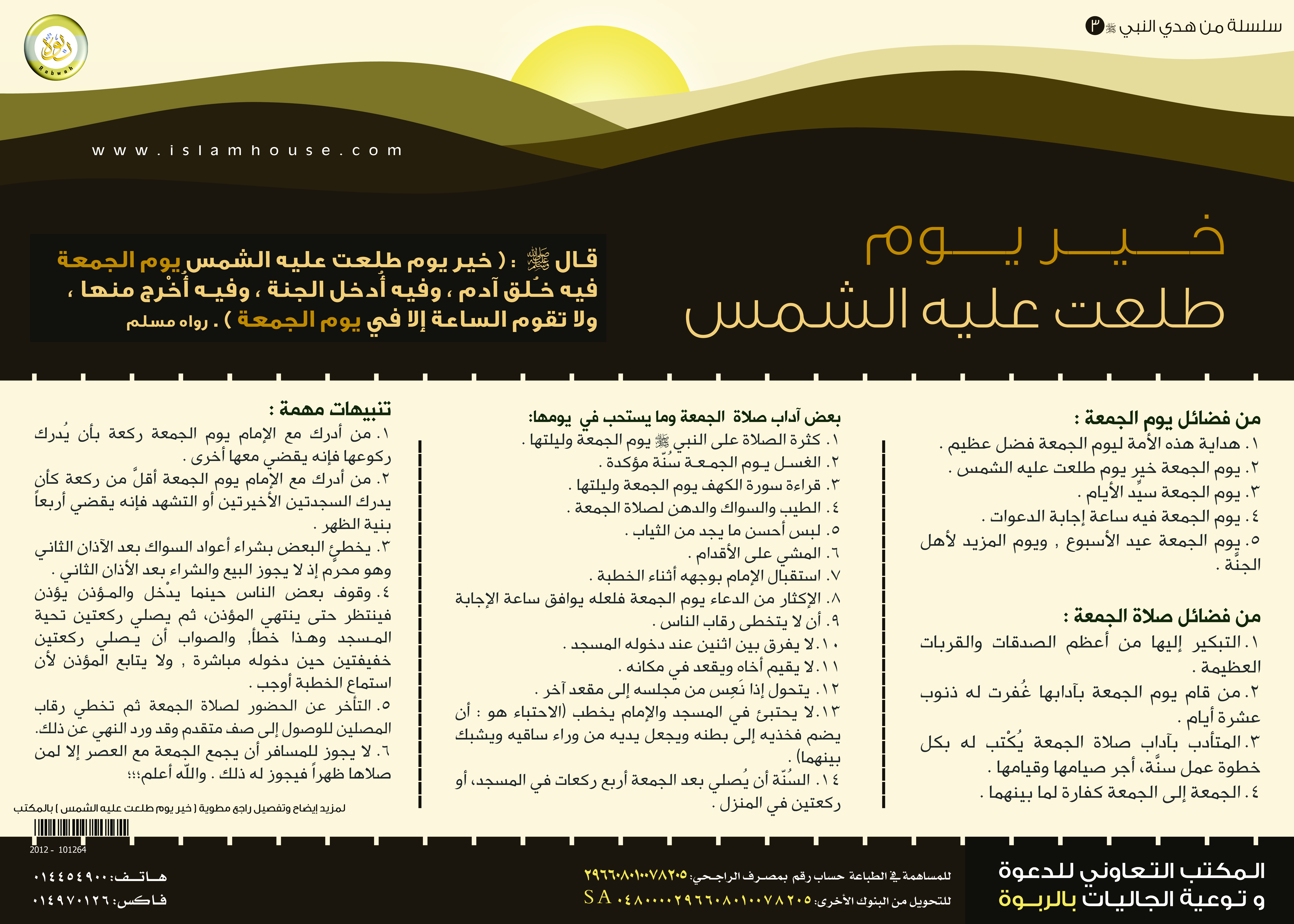 بوستر متميز يبين أن يوم الجمعة هو خير يوم طلعت عليه الشمس، مع بيان فضائل هذا اليوم، وبعض فضائل صلاة الجمعة، وبعض آدابها، مع تنبيهات مهمة.