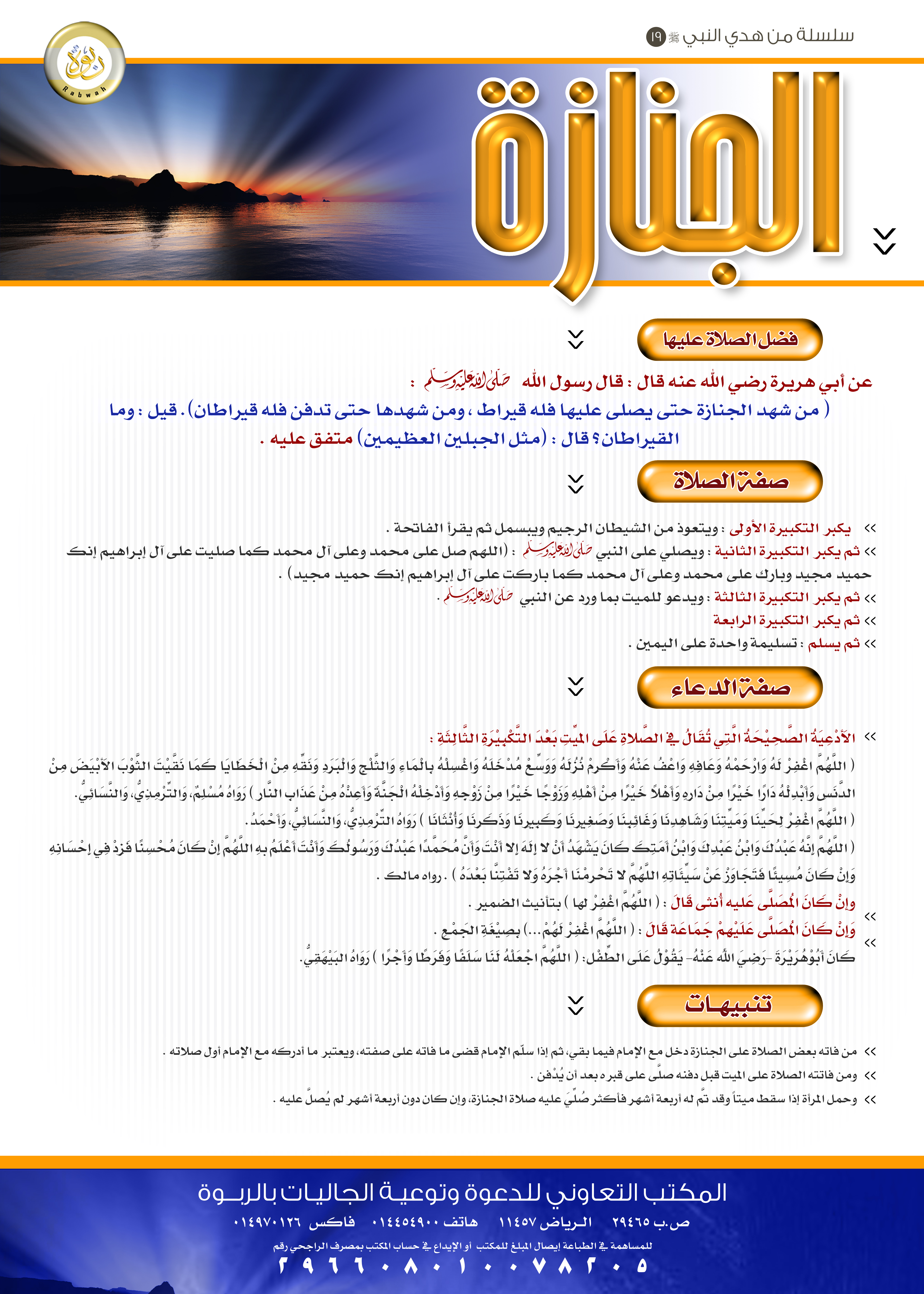 بوستر يبين فضل صلاة الجنازة، وصفتها، مع بيان بعض الأدعية الصحيحة التي تقال في الصلاة على الميت بعد التكبيرة الثالثة.