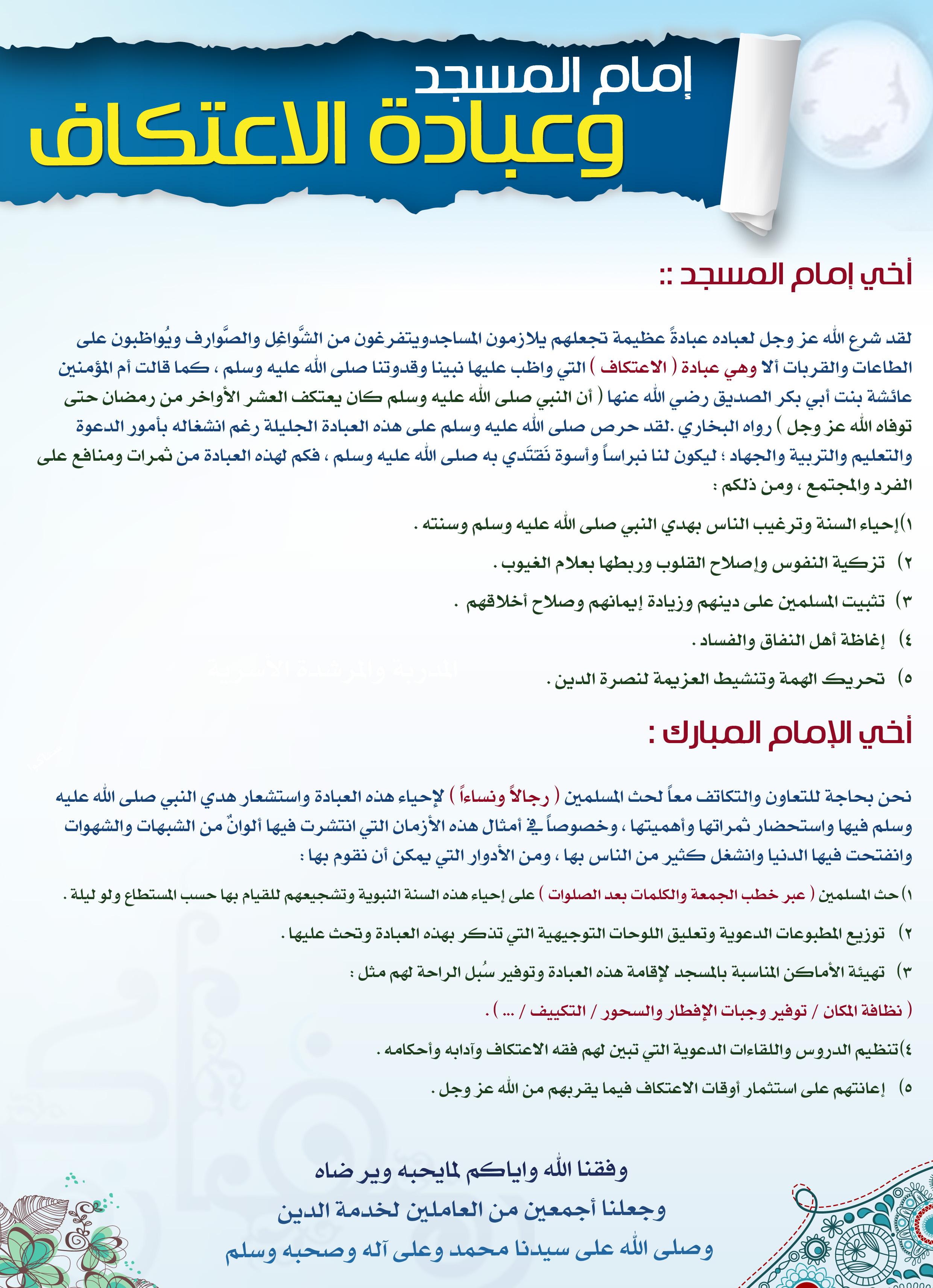 بوستر يحتوي على بعض ثمرات ومنافع الاعتكاف على الفرد والمجتمع، مع بعض النصائح والتوجيهات للأئمة لحث المسلمين على إحياء هذه العبادة.