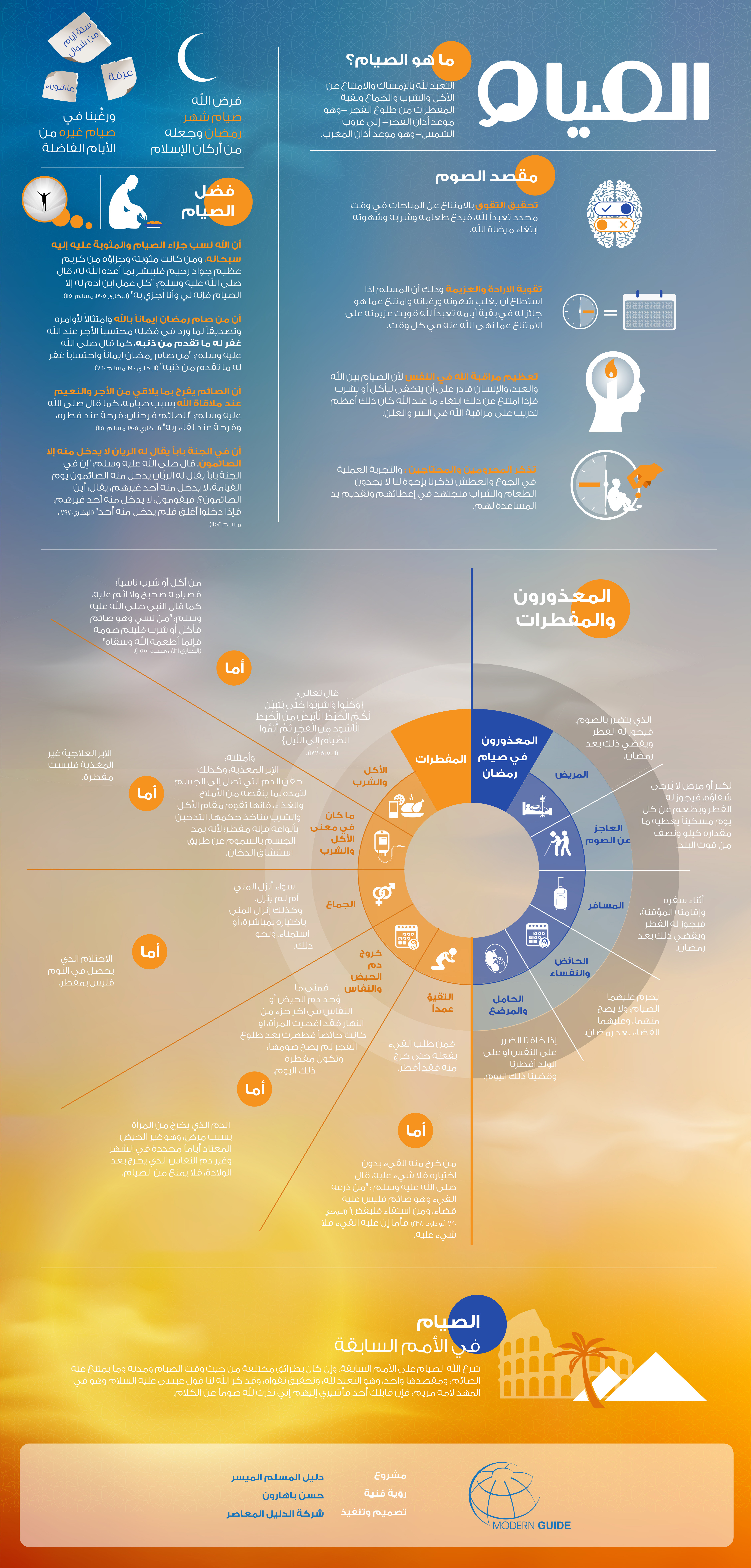إنفوجراف يحتوي على معلومات عن الصيام، والمقصد منه، وبعض فضائله، مع بيان بعض الأحكام المتعلقة به.