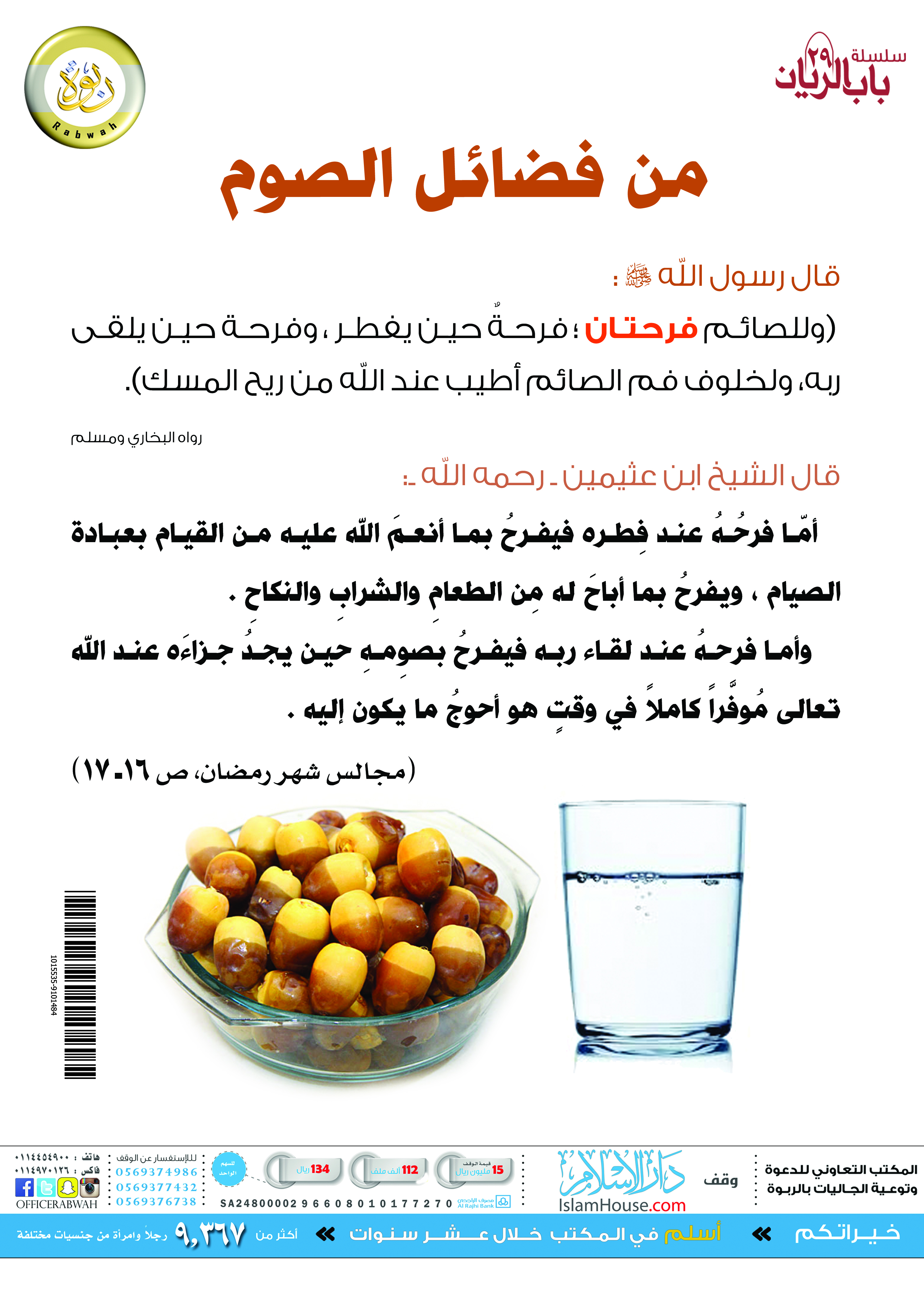 بوستر يحتوي على تعليق للشيخ ابن عثيمين - رحمه الله - على حديث: {وللصائم فرحتان: فرحه حين يفطر، وفرحة حين يلقى ربه، ولخلوف فم الصائم أطيب عند الله من ريح المسك}.