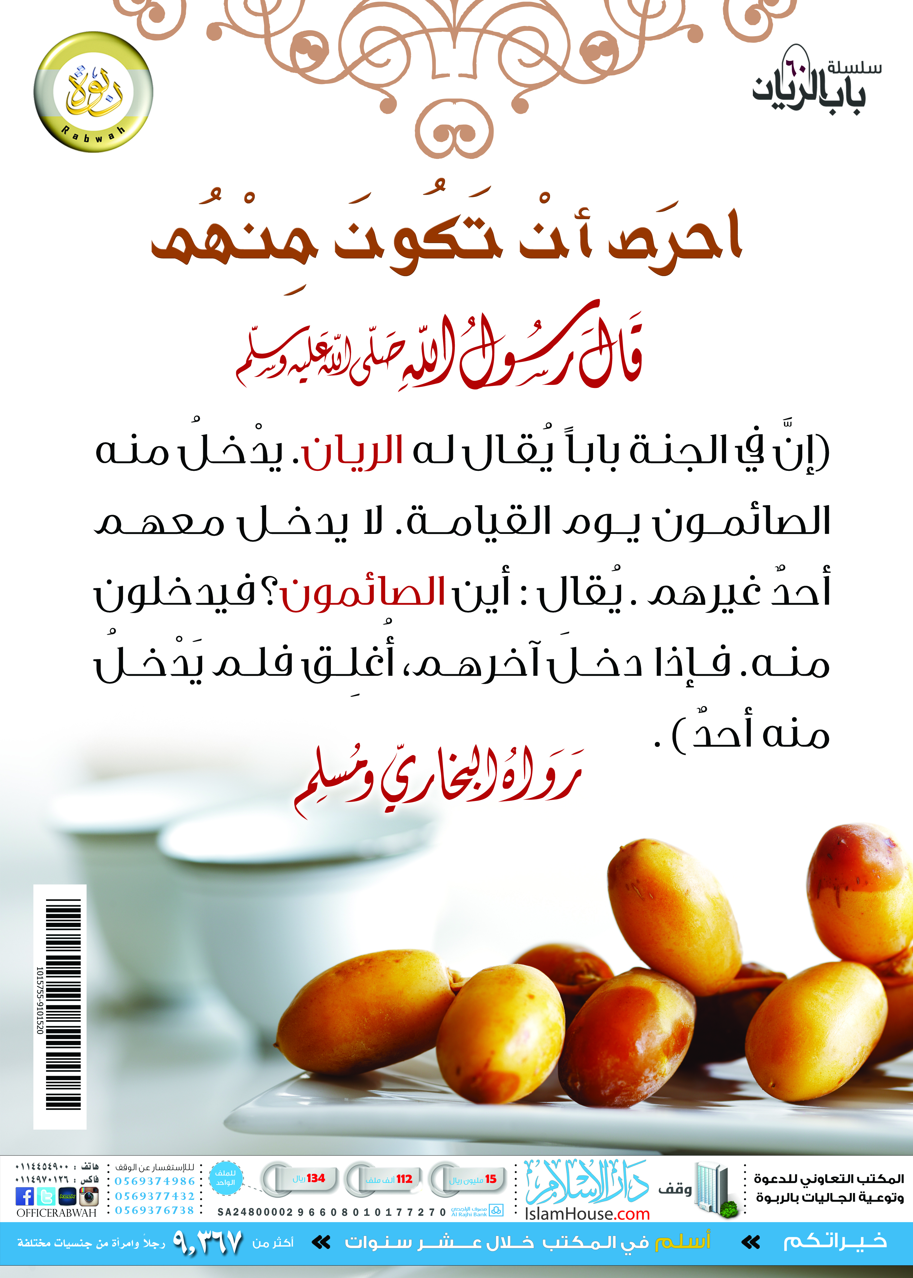 بوستر يبين بعض فضائل الصيام، وأن في الجنة بابًا يقال له: الريان، يدخل منه الصائمون يوم القيامة، لا يدخل منه أحدٌ غيرُهم.