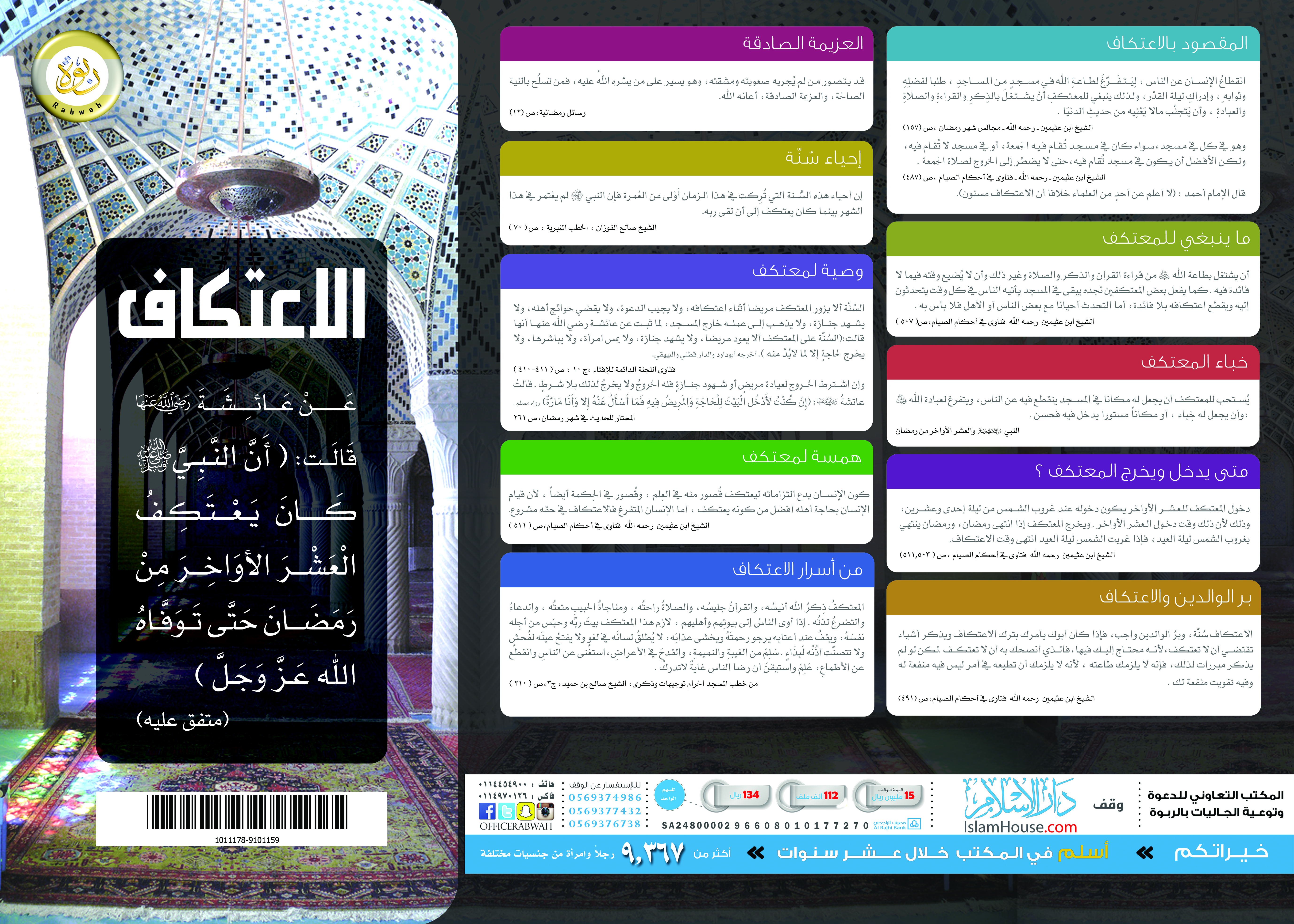 بوستر متميز يبين المقصود بالاعتكاف، مع بيان بعض أحكامه، وأسراره، وبعض النصائح للمعتكفين.