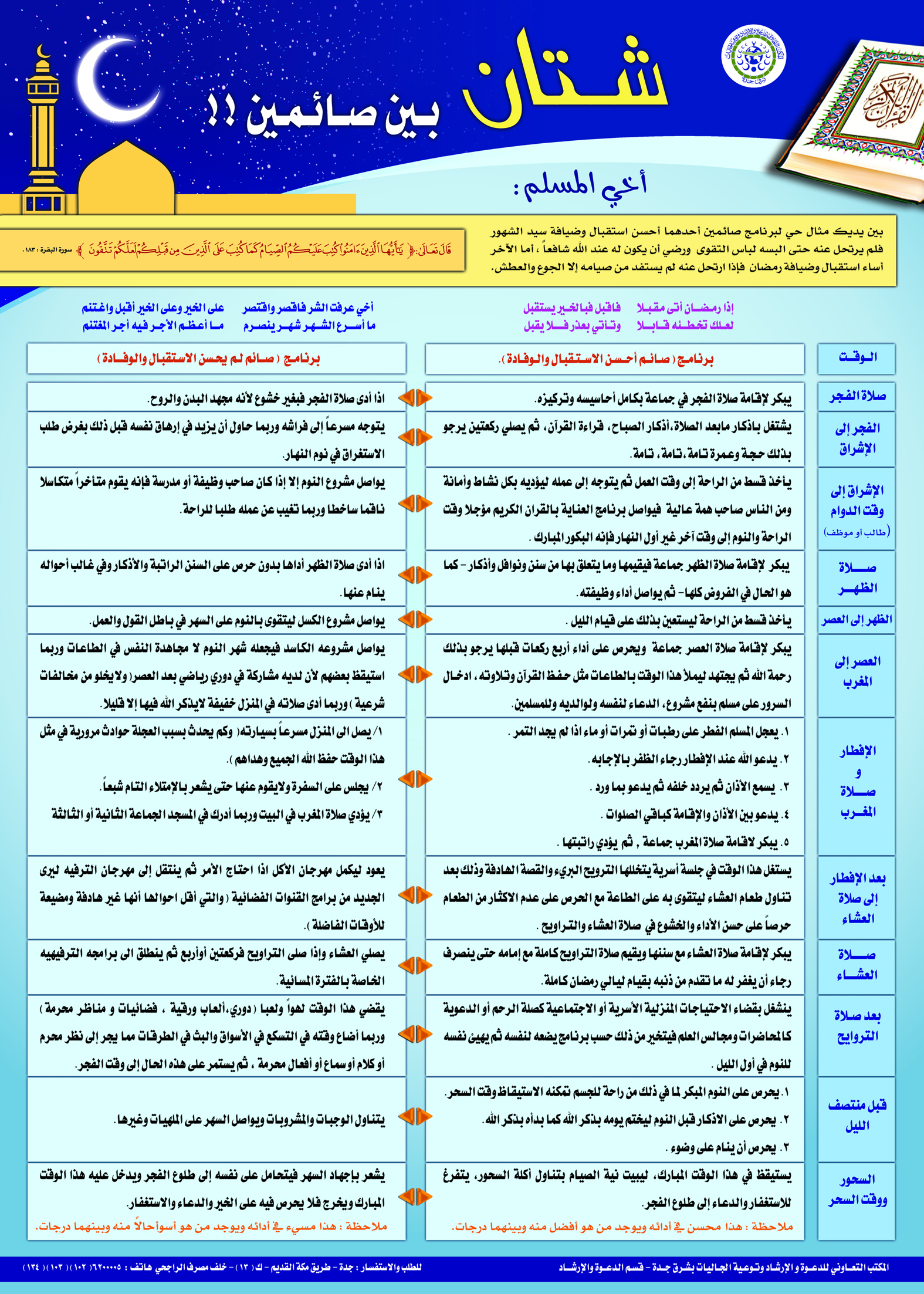 بوستر متميز يحتوي على مثال حي لبرنامج صائمين، أحدهما: أحسن استقبال واستضافة سيد الشهور؛ فلم يرتحل عنه حتى ألبسه لباس التقوى، والآخر: أساء استقبال وضيافة رمضان؛ فإذا ارتحل عنه لم يستفد من صيامه إلا الجوع والعطش.
