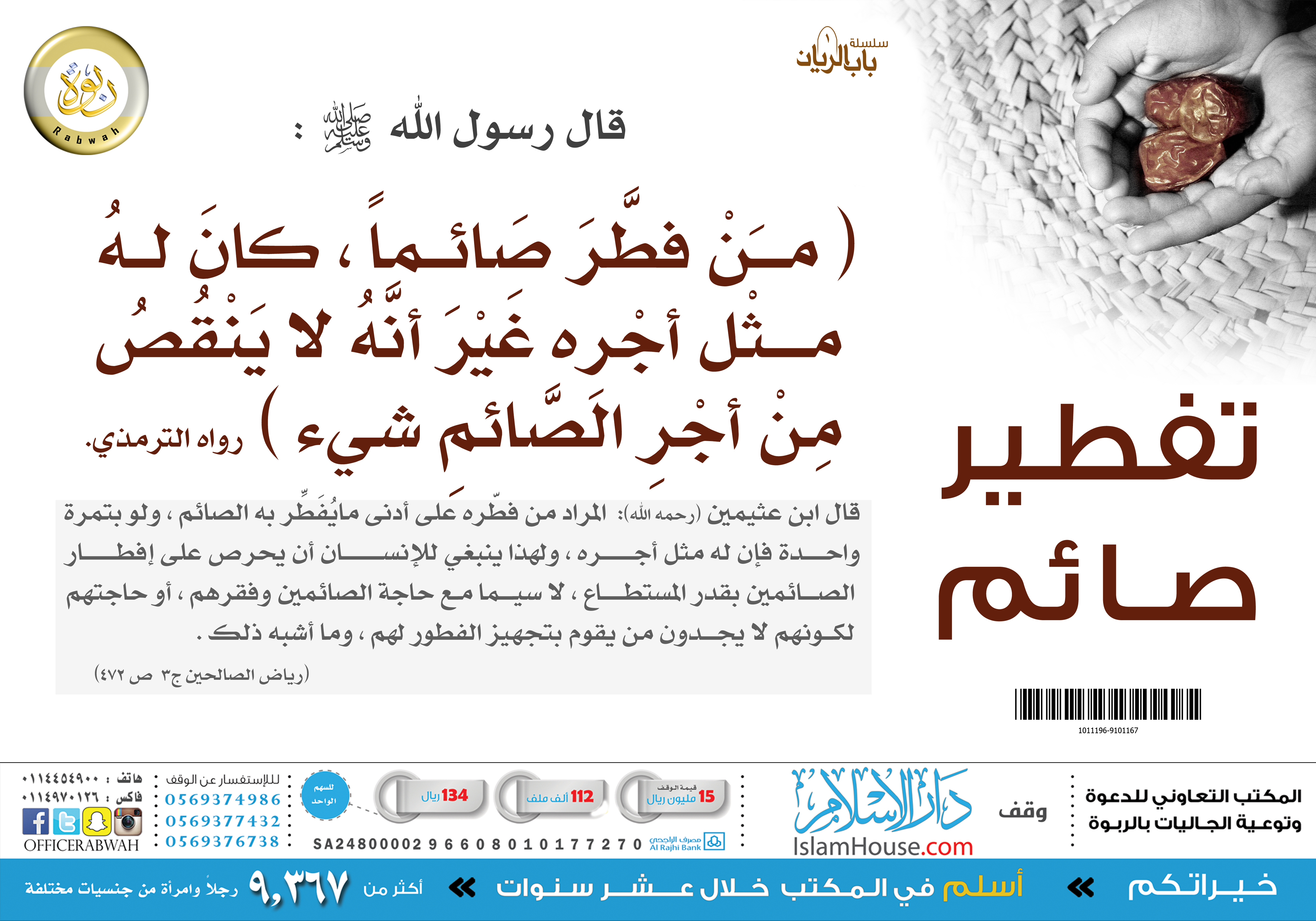 بوستر يحتوي على حديث: {مَنْ فَطَّرَ صَائِمًا كَانَ لَهُ مِثْلُ أَجْرِهِ غَيْرَ أَنَّهُ لَا يَنْقُصُ مِنْ أَجْرِ الصَّائِمِ شَيْئًا} مع تعليق للشيخ ابن عثيمين - رحمه الله -.