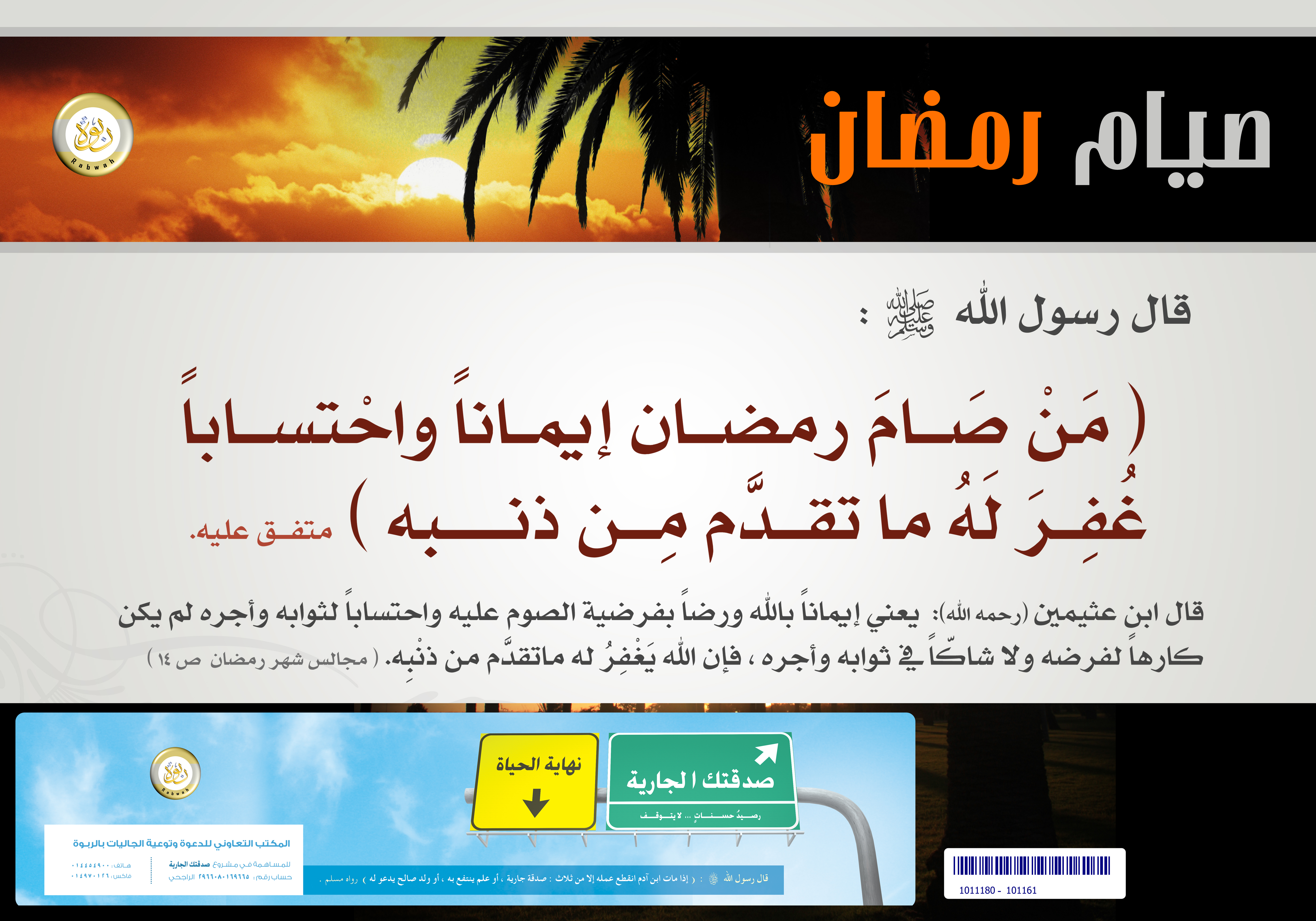 بوستر يحتوي على الحديث المتفق عليه: {مَنْ صَامَ رَمَضَانَ إِيمَانًا وَاحْتِسَابًا غُفِرَ لَهُ مَا تَقَدَّمَ مِنْ ذَنْبِهِ} مع تعليق للشيخ ابن عثيمين - رحمه الله -.