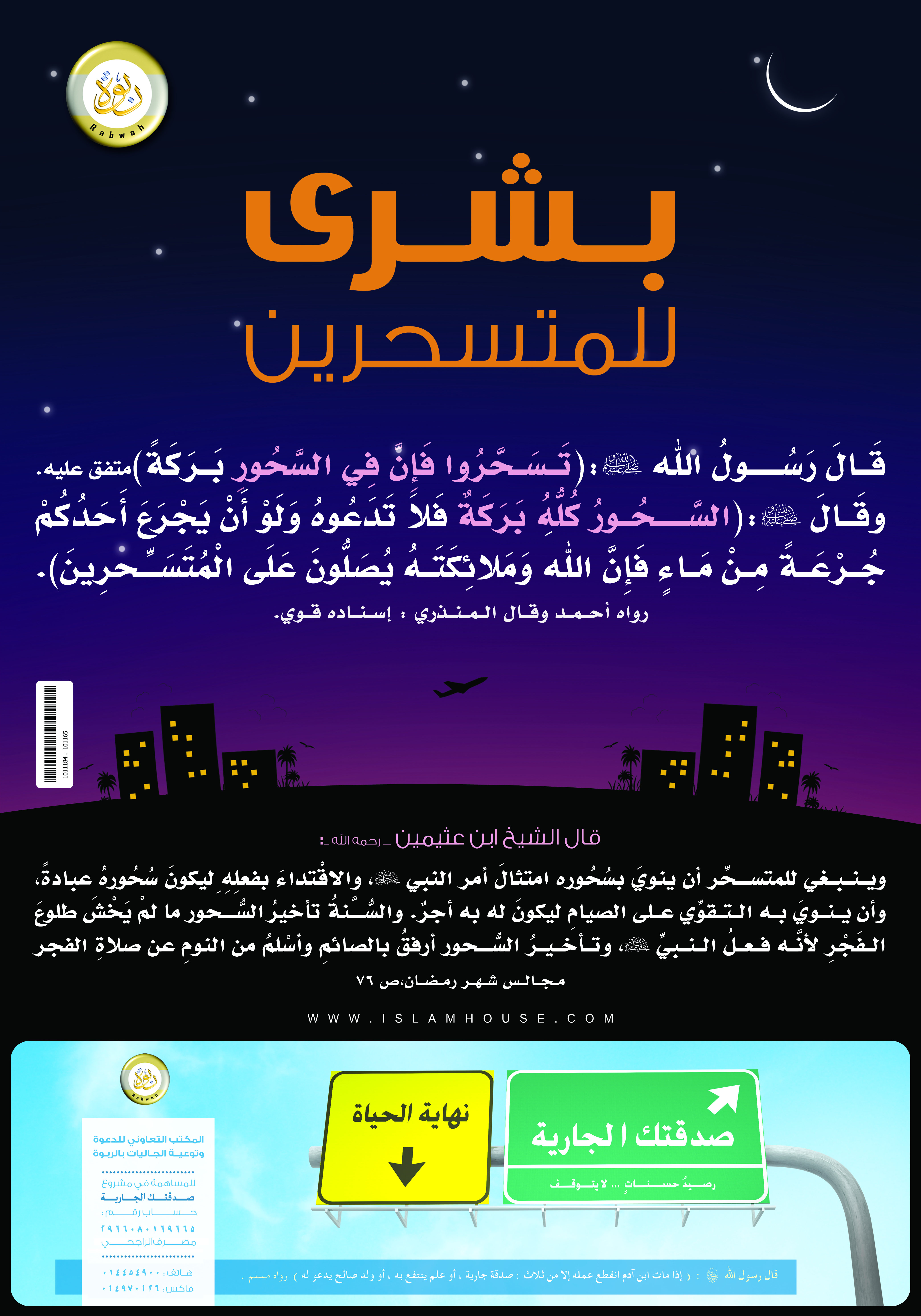 بوستر يحتوي على حديثين في فضل السحور، مع تعليق مختصر للشيخ ابن عثيمين - رحمه الله -.