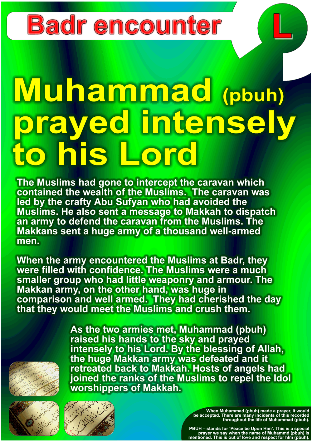 A design in English illustrates the Battle of Badr which took place in Ramadan of the second year after the Prophet's immigration in which the Muslims defeated the army of the polytheists of Quraish.