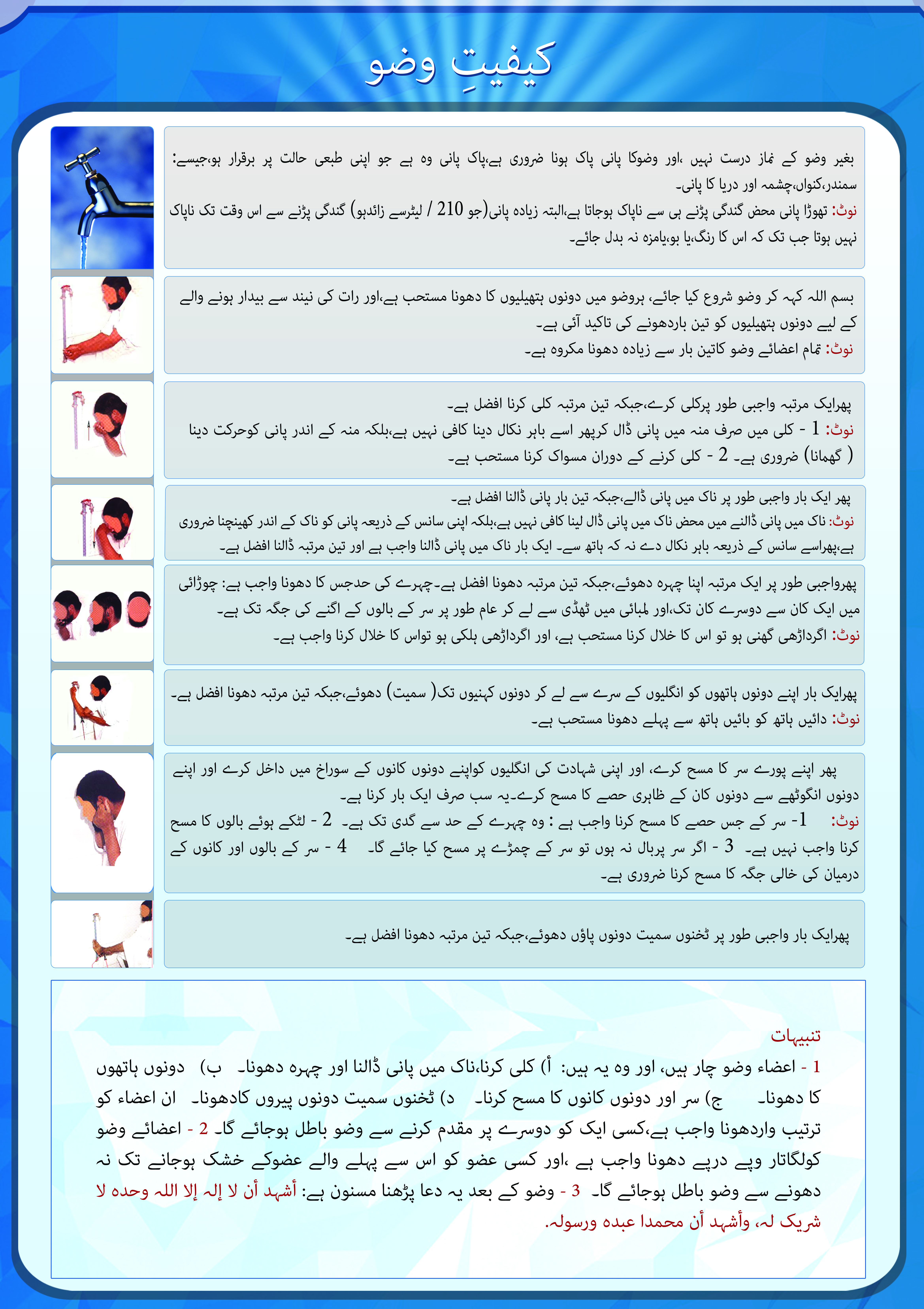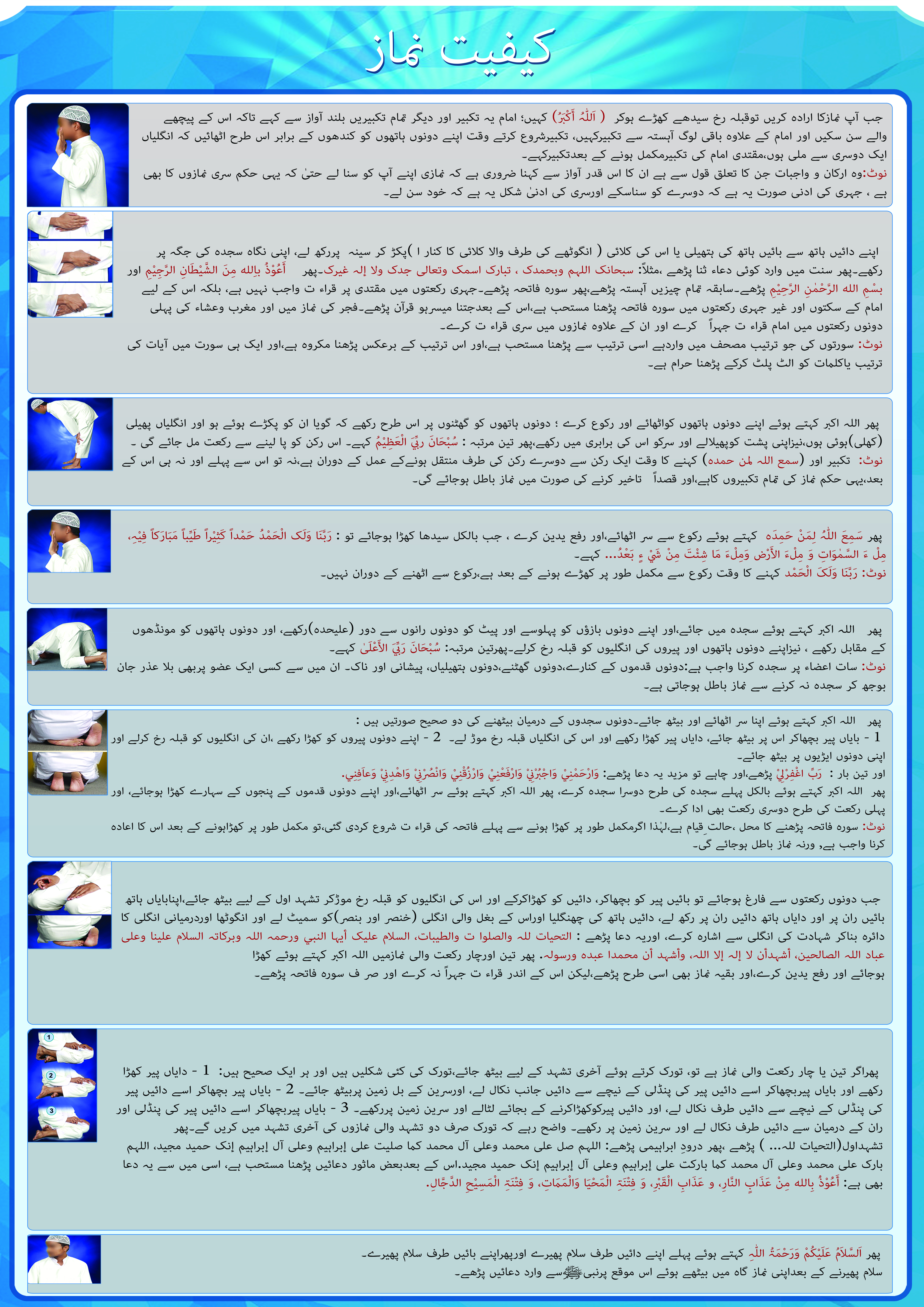 اس پوسٹرمیں مختصرطورپر وضو،صلاۃ(نماز)کا طریقہ بیان کیا گیا ہے اورآخرمیں اہم خاتمہ ہے جس میں اس بات کا ذکر ہے کہ علم عمل کا متقاضی ہے۔